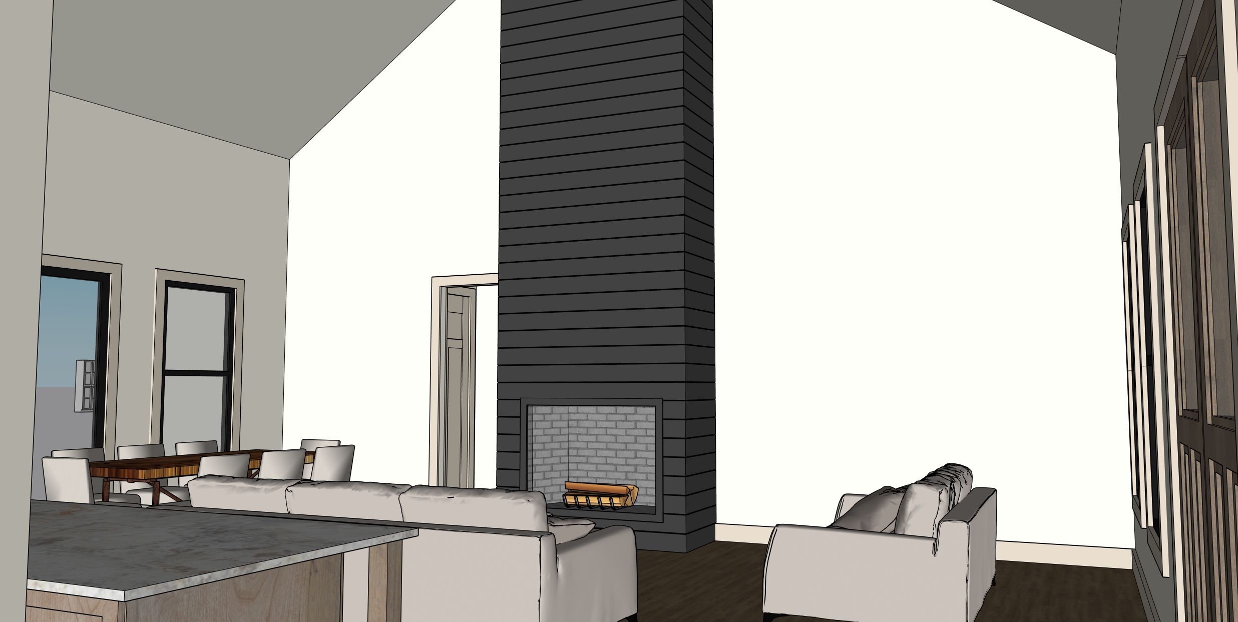 add mantel and tv above fireplace add can lighting add ceiling fan drop down from ceiling add decor wooded lot outside windows