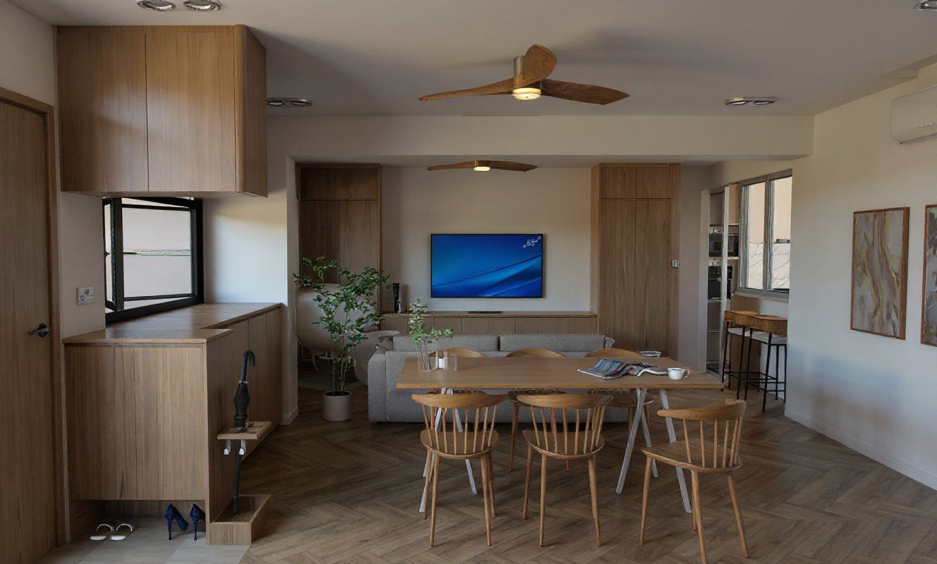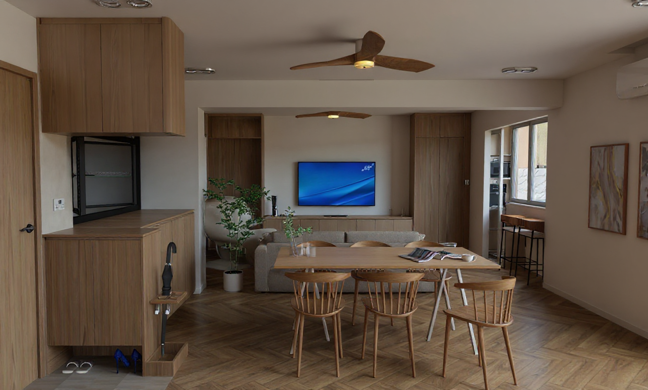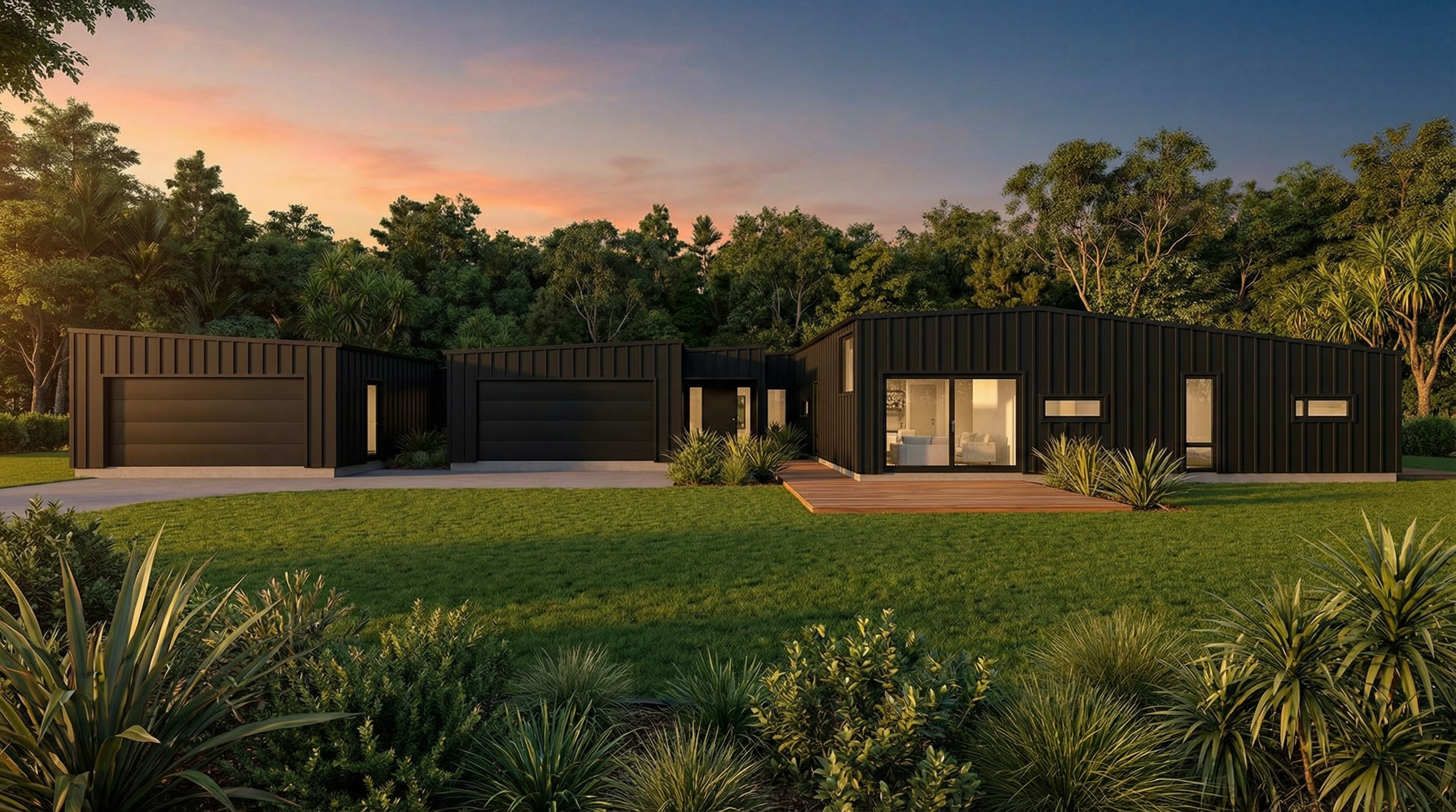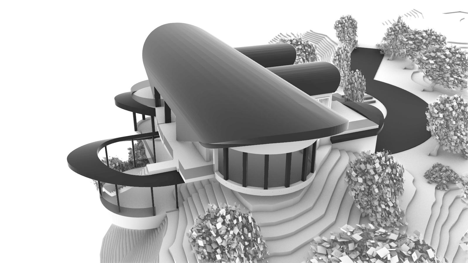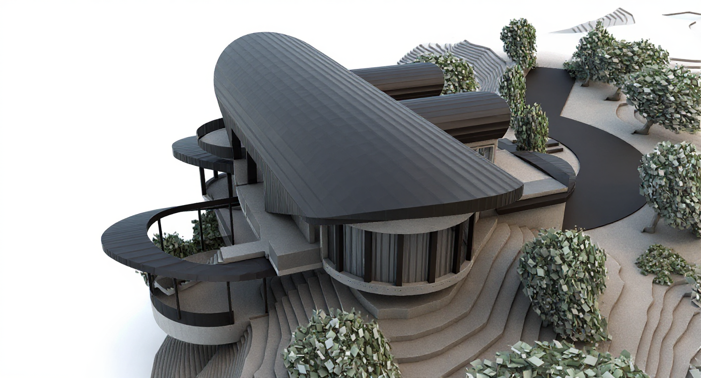 render the exact building geometry from the reference image with soft realistic textures apply all materials with accurate clearly readable surface detail 1 roof black corrugated metal very important full texture detail required the roof must appear as deep high contrast corrugated metal with strong clearly defined ribs running continuously along the entire curved roof form visible shadowing between each rib to express depth directional highlights that follow the curvature of the roof texture that reacts to light realistically not a smooth or semi smooth surface no flattening no blurring no softening of the rib pattern corrugation spacing should be consistent industrial and crisp even on curved portions make the roof texture the most visually dominant material detail in the render 2 exterior walls vertical metal panels show distinct vertical seams between panels subtle depth light shadowing along each seam light gray metal finish with gentle variation no flat gray shading 3 windows black steel frames thin precise dark steel mullions sharp edges with matte or semi matte reflections realistic glass behavior subtle reflections slight tint maintain exact window geometry from the model 4 general atmosphere soft diffused lighting mild atmospheric haze for depth preserve all curved surfaces cantilevers terraces and site topography exactly as shown produce a clean architectural visualization with extremely clear roof corrugation accurate metal panel seams and crisp steel window framing