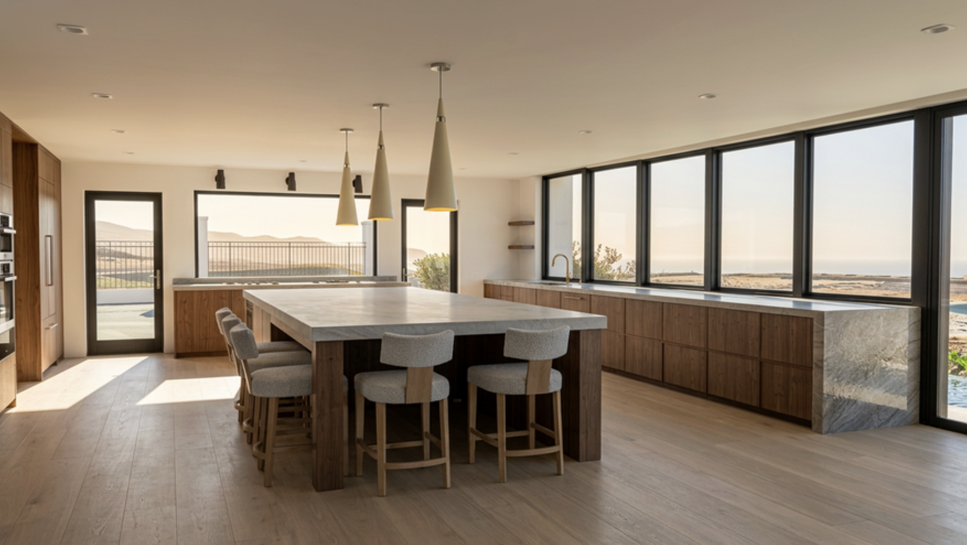 can you make the cabinetry even lighter change the stools to black and white modern stools change the sconces and add modern glam pendant lighting
