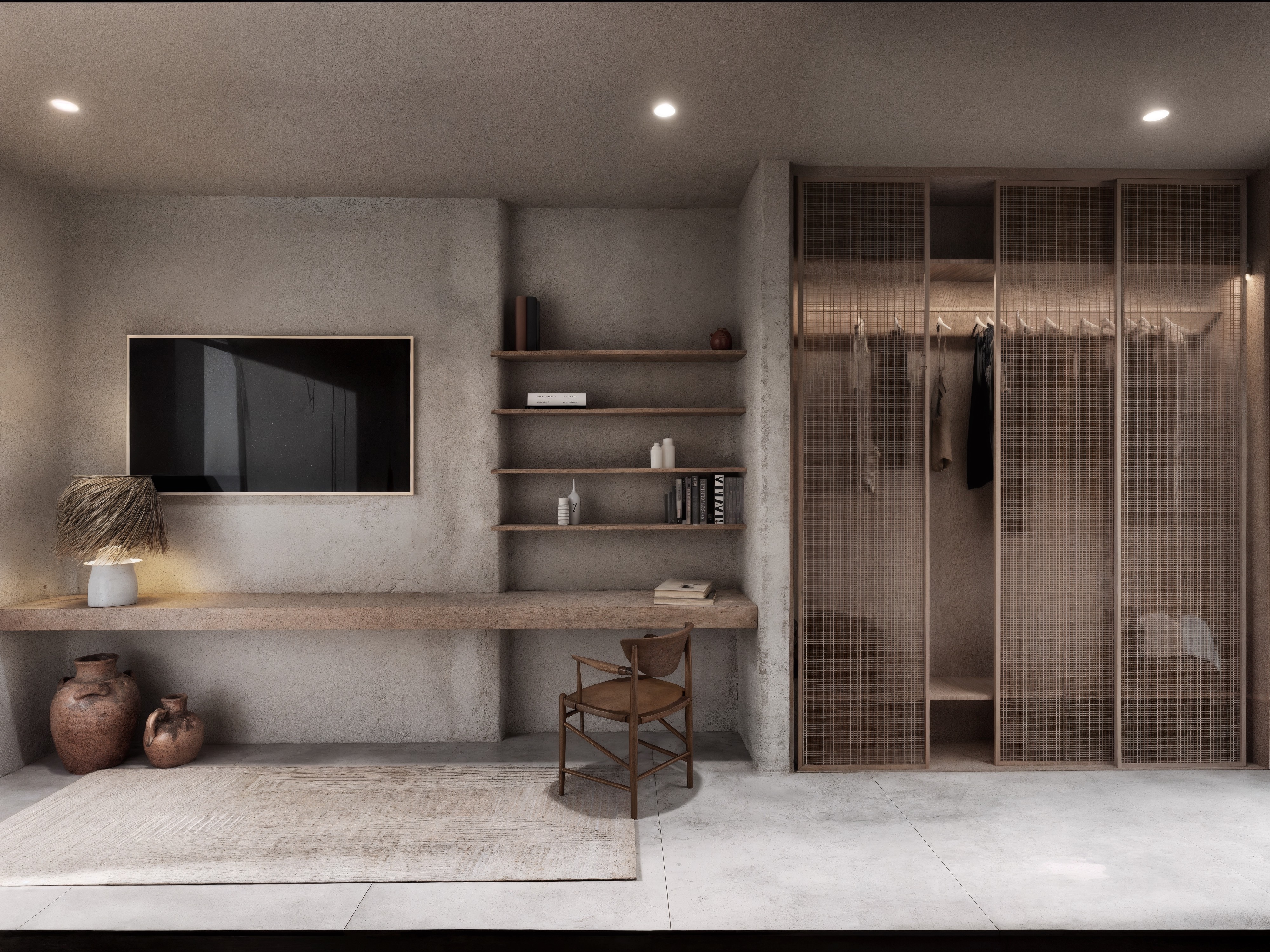 interior shot after the closet there is a bench 75 cm height from the floor with a hanging mirror up and then i want a build sofa style minimal raw island floor limestone and minimal raw island 1 daylight architecture