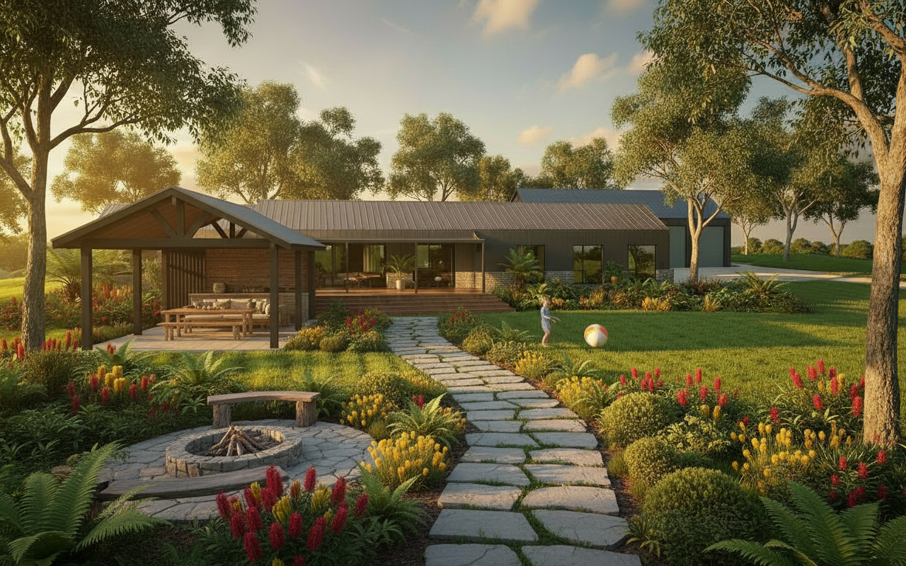 a housing estate of single family houses in the countryside with a nicely landscaped garden and terrace next to each house with fields and forests in the background all on a slight hill a paved road runs behind the estate to the north