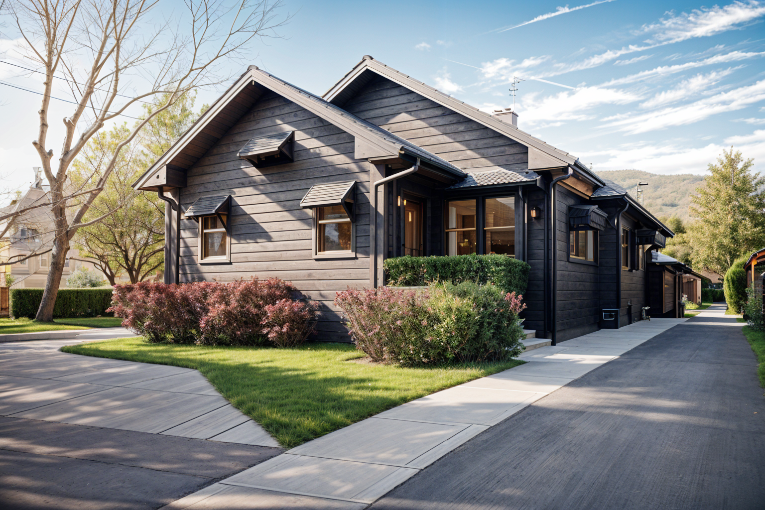 barndominium exterior shot money shot of a house with vertical metal paneling on the two from facing sides and horizontal wood panelling on the side by the stairs there is a concrete driveway in the foreground of the image and grass the shot is taken in a suburban neighborhood with trees during sunset architecture