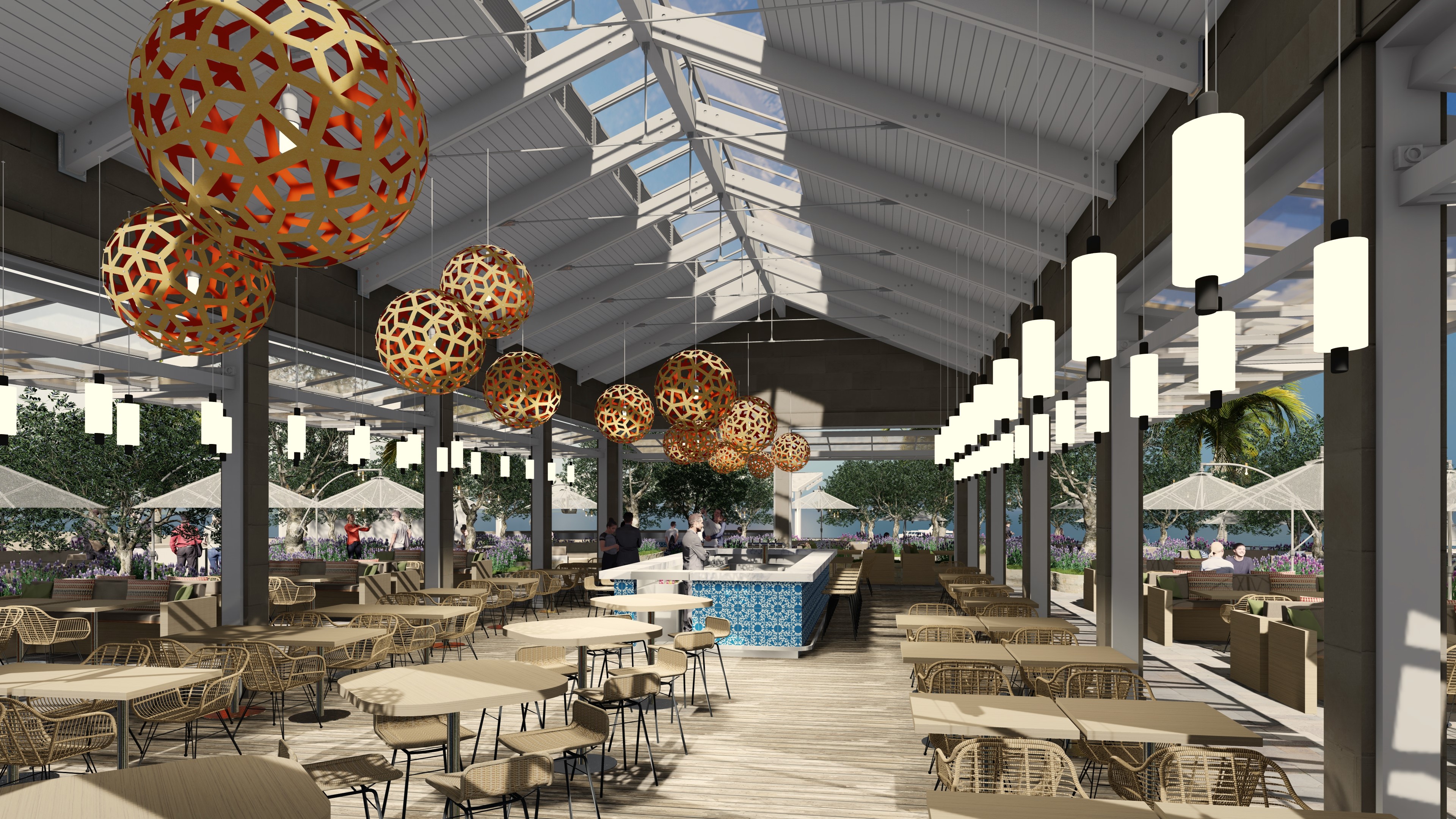 night view with some setting sun light still visible enhance the materials and lighting effects in the input image add people sitting at the most of the tables having dinner dressed casually for a beach resort add some waiters serving the guests add some people at the bar having drinks add some small lanterns hanging in the trees outside add people dining in the tables in the center of the view add some wear to the wood flooring material make the light from the hanging pendant lights warmer in color add people at the rounded square top tables with the stools in the center of the space having drinks add led lighting under the bar top add more people having dinner at the tables add some up lighting on the olive trees outside