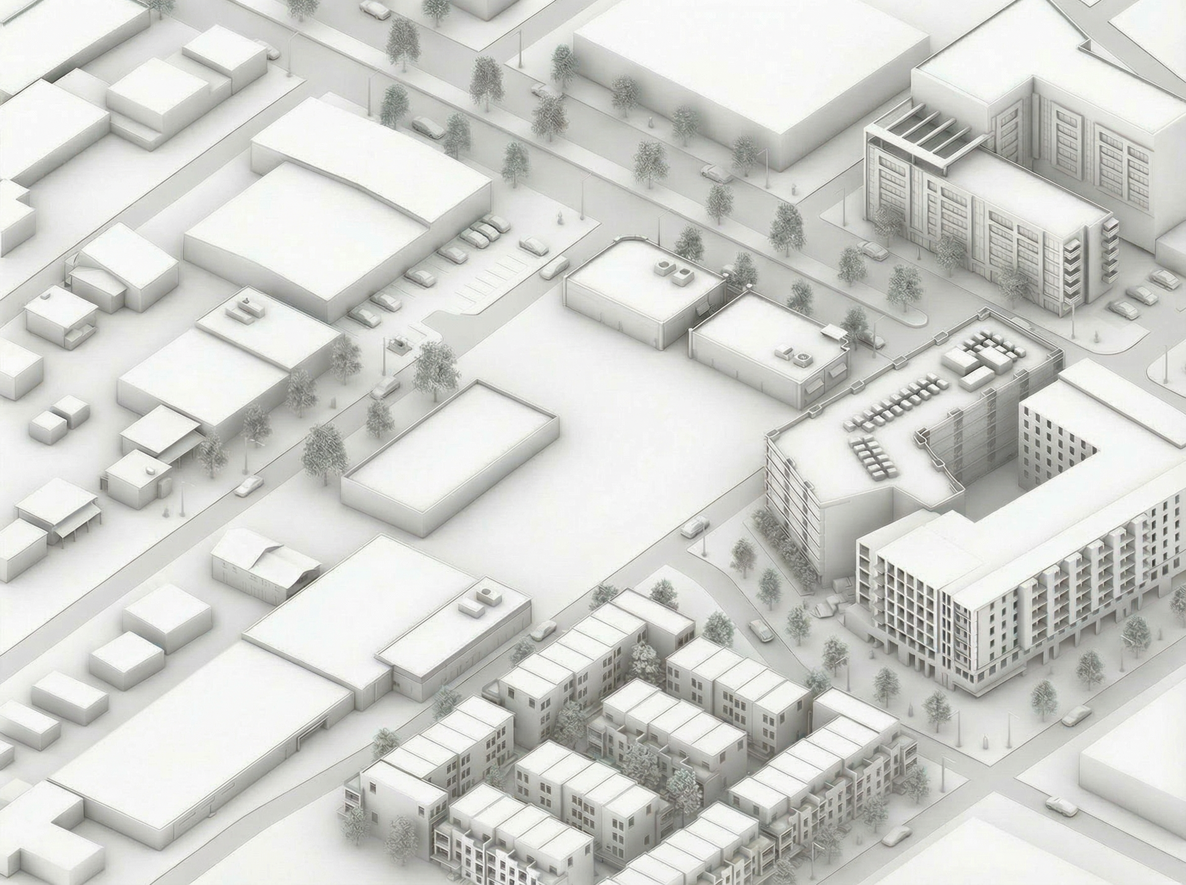 ake only the following extremely small adjustments 1 remove 2 3 additional trees from the center of the townhome block so the planting reads lighter and less dense 2 reduce the number of trees along the left outside edge of the blank parcel by removing 1 2 trees keep only a minimal hint of vegetation there 3 randomize the spacing of the median trees slightly more they should not look evenly spaced introduce small natural gaps 4 increase overall brightness slightly about 5 8 while keeping the clean clay tone avoid increasing contrast or darkening the ao do not add new objects do not remove or modify any buildings roads cars streetlights or rooftop equipment do not add any trees to new areas do not change any geometry final result should look identical to the current image with only these four subtle refinements