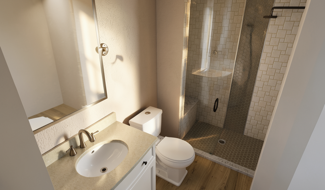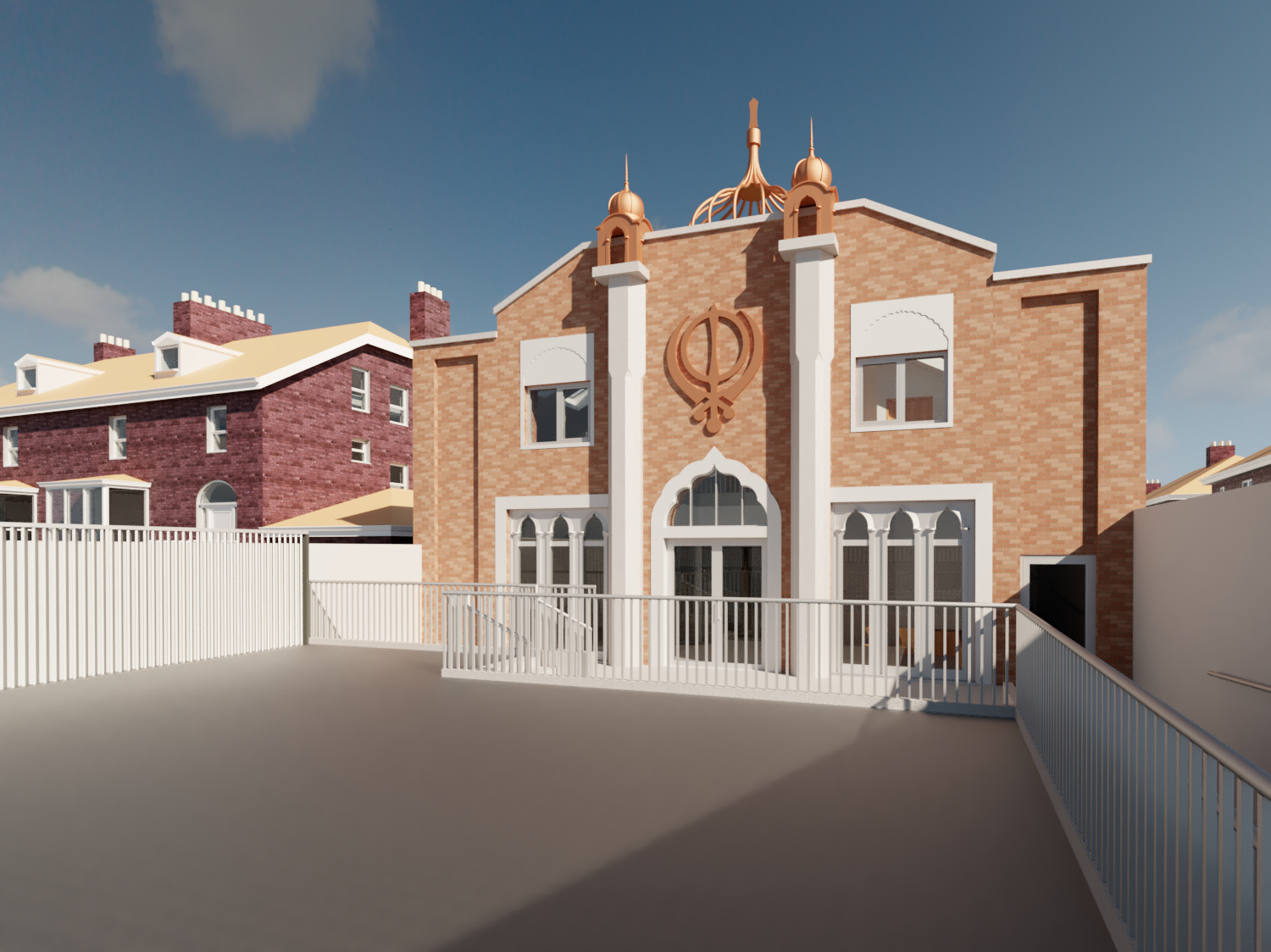 a beautifully rendered image of a traditional temple building with a serene atmosphere the building features light orange brown brick walls complemented by ornate white columns and window frames the golden emblem on the facade adds a touch of elegance surrounding buildings are made of rich red brick with soft beige roofs the sky is a clear vibrant blue dotted with a few fluffy white clouds casting gentle shadows the warm sunlight enhances the colors creating an inviting ambience