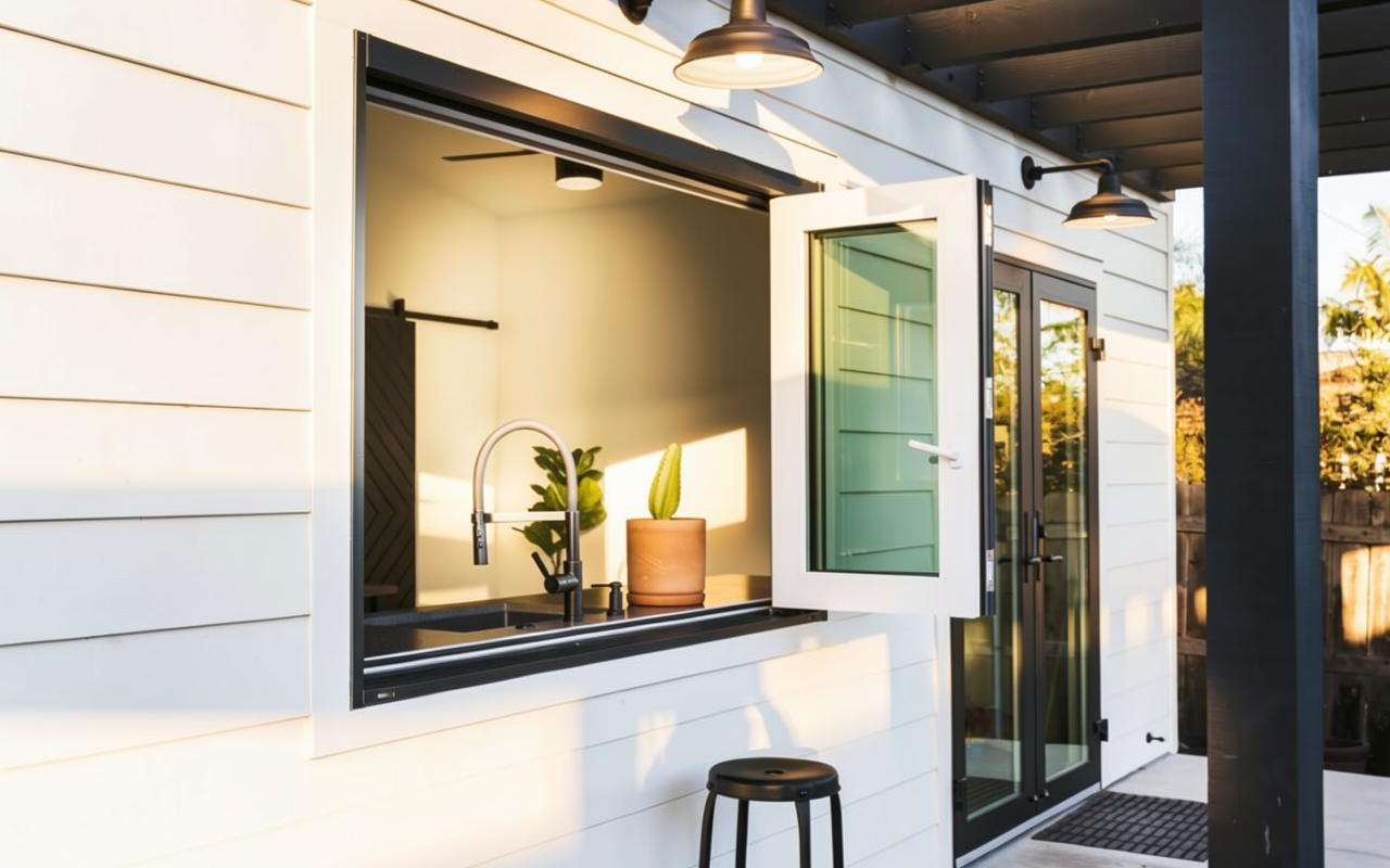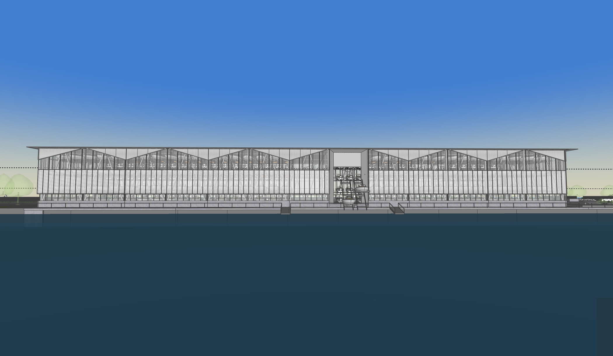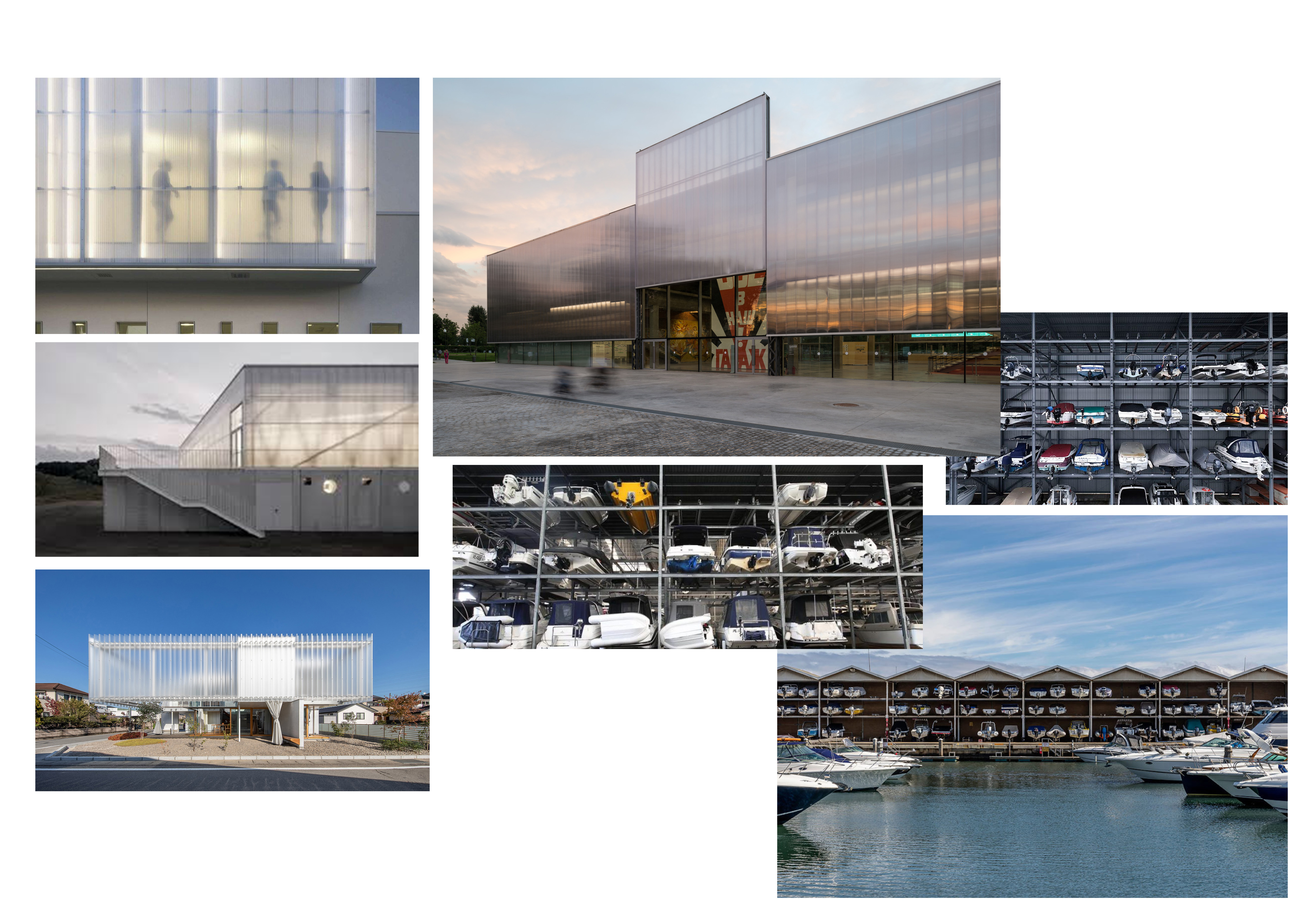 exterior shot a dry dock boat storage viewed from across the water facade made from polycarbonate with dry dock boat storage visible behind it building has a board form concrete base afternoon sun some internal light