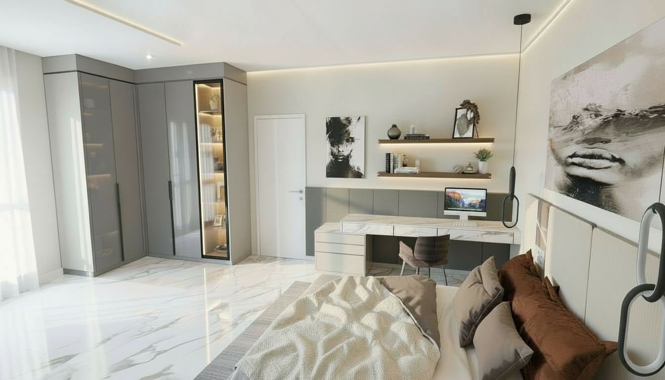please add led effect to pendants please make grey wardrobe doors matt leave everything else as is