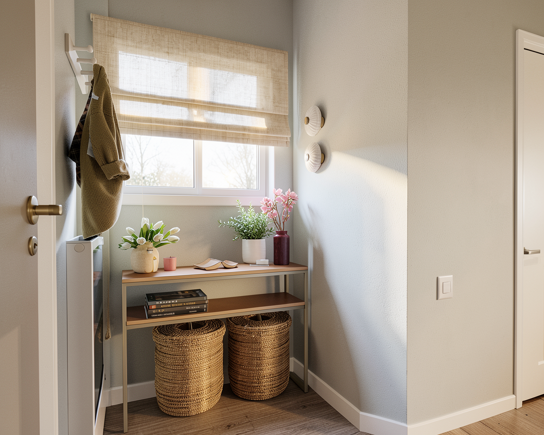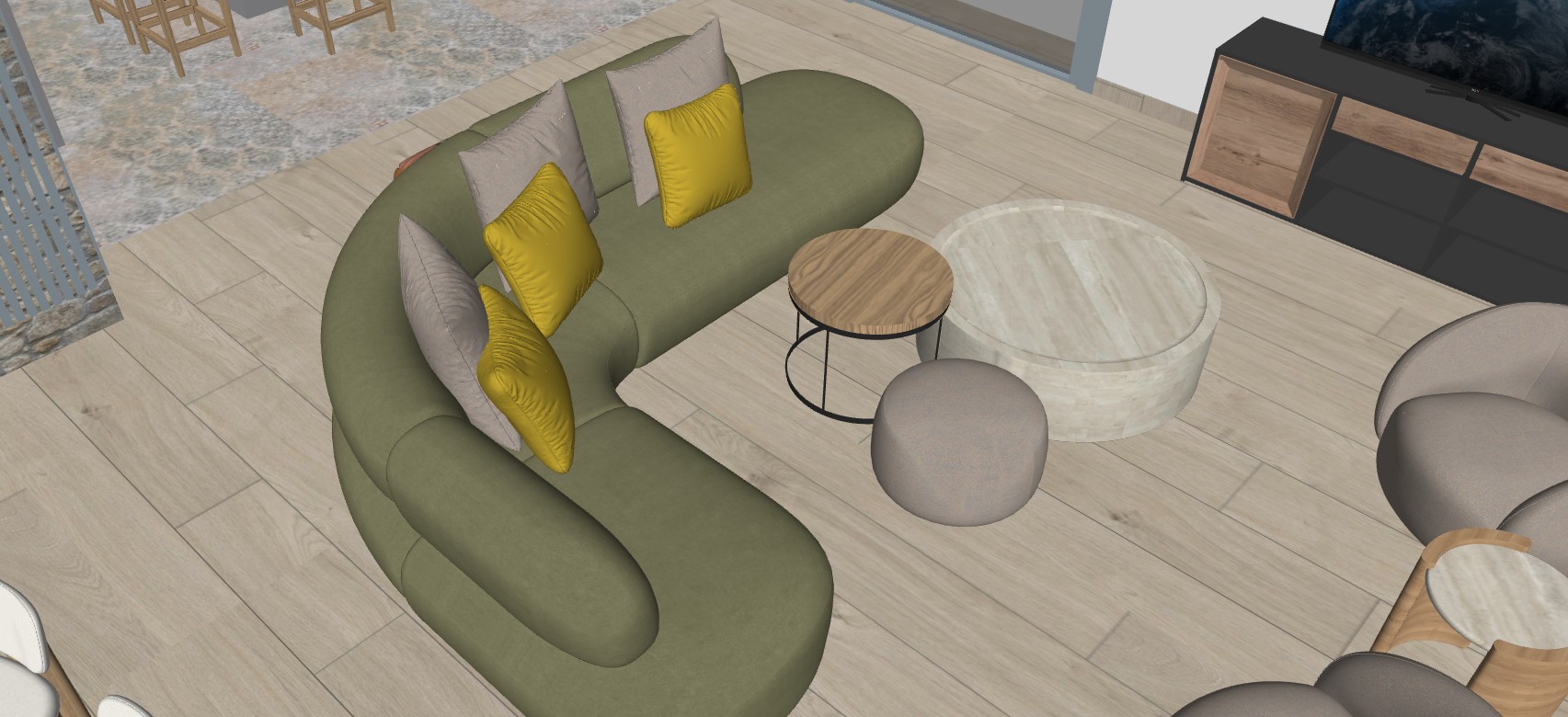 suelo de parquet madera natural claro pouff en color marron claro mesa grande redonda en marmol travertino sofa en textil verde militar