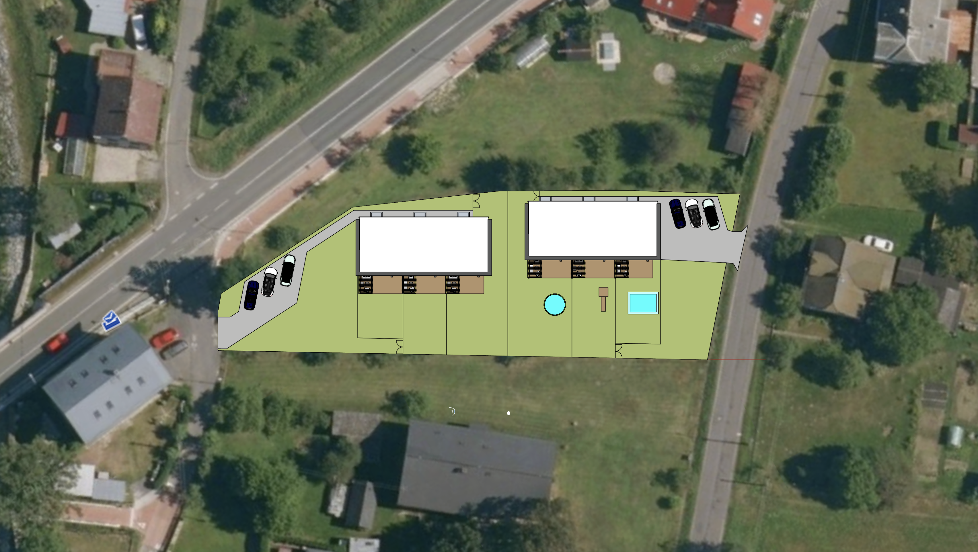 p eve koncept z obr zku do fotorealistick ho pohledu vykresli 2 modern obytn budovy s plochou st echou a atikami s antracitov m oplechov n m st e n krytinu prove v designu sv tle ed f lie jde o d m se t emi byty ka d s vlastn terasou a pergolou d ev n pergoly by m ly b t v barv p rodn ho sv tl ho dubu s tuln mi venkovn mi idlemi s b l m pol t em d ev n terasy vykresli z mod nov ch prken uprav vybaven pod pergolou tak a je u ka d ho bytu jinak rozm st no ploty kter jsou nyn nazna eny jsou elegantn matn ern prove napojen zpevn n ch ploch na st vaj c komunikace zpevn n plochy vykresl jako zatrav ovac dla dice vykresli tr vn k zelen plochy mezi nazna en mi ploty realisticky dle travnat ch ploch v okol vytvo klidnou atmosf ru s jemn m p irozen m osv tlen m kter napov d o zata en m dni s jemn m v nkem a sv zelenou tr vou obklopuj c sc nu
