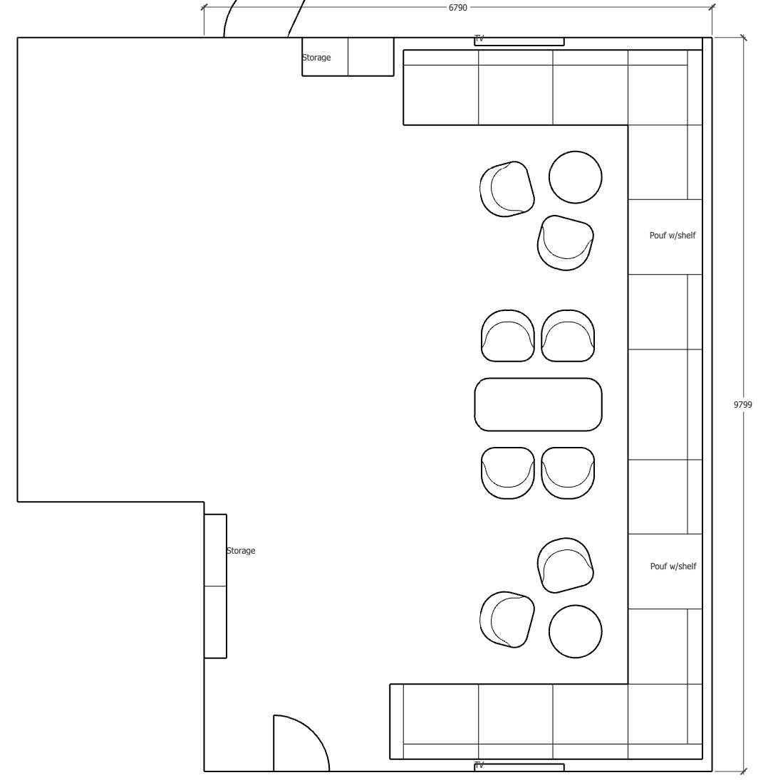 convert this floor plan into a realistic isometric 3d view of a living room show the space from an elevated angle with furniture walls and details visible blue lounge sofa with fixed to floor tables and lounge chairs around the area is onboard a ship use the same furniture as shows on the plan do not change the orientation of the floorplan