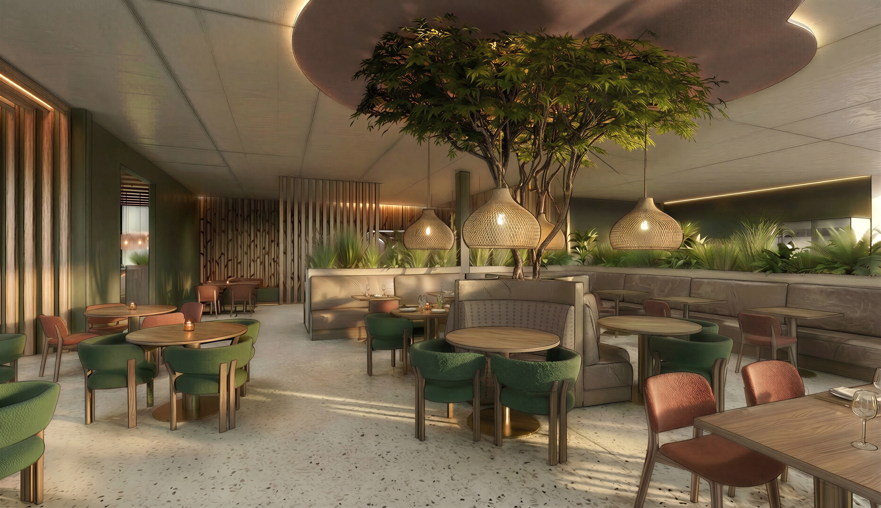 the earthy colored fabric of the chairs may be taupe and the terrazzo floor may be beige with speckles in terra black and green