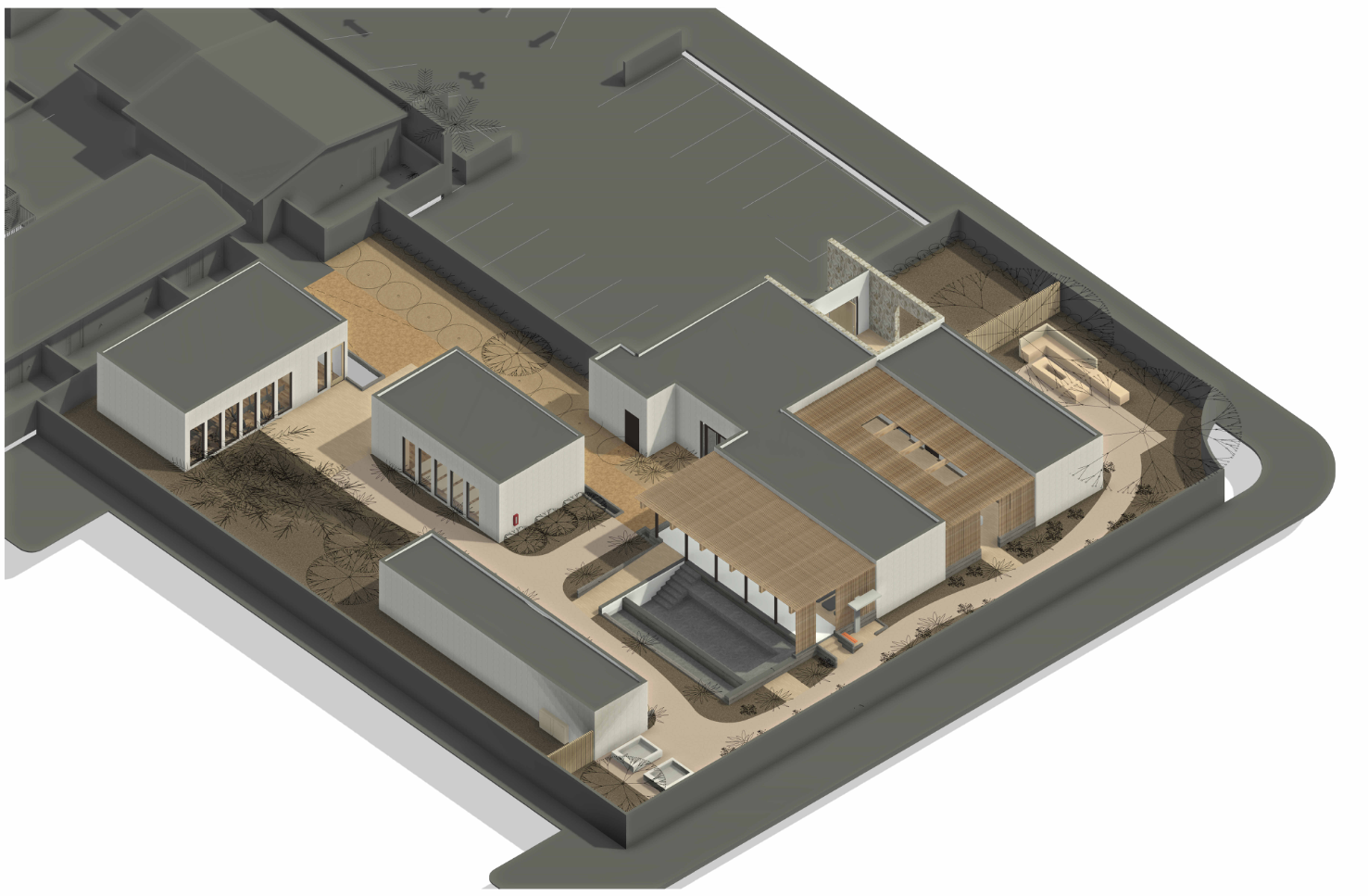 aerial image of luxury hotel in palm springs lush desert landscape with lots of palm trees olive trees boulders