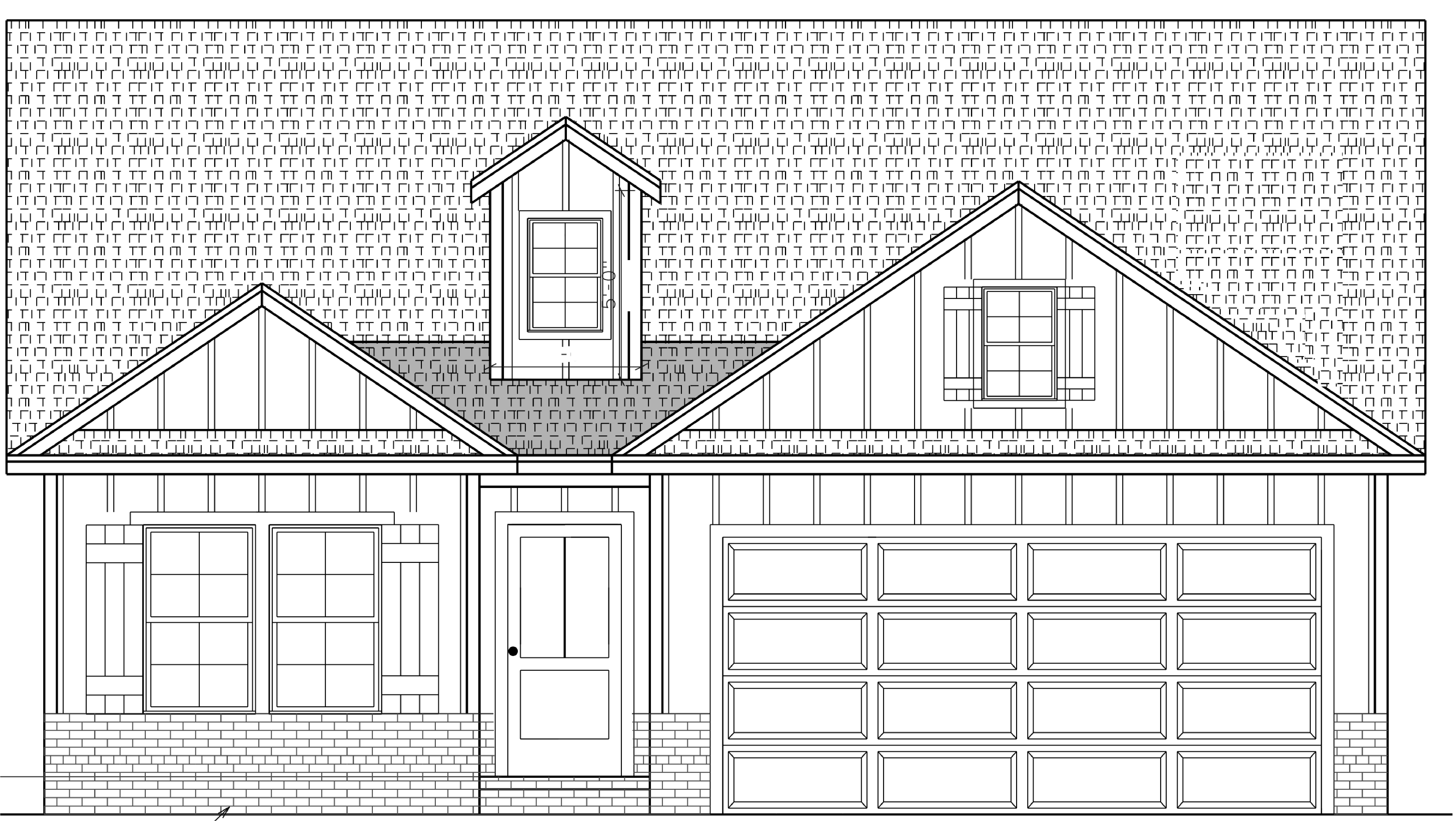 black roof white vinyl siding cream brick on lower third black shutters white garage door white window frames black window grids black window mullions 4 over 4 window grids black front door black lantern style lights on either side of garage concrete driveway extending out from garage to the bottom of the image sidewalk from front door to driveway light landscaping change angle of roof at the base of the dormer in the middle of a green lawn with scattered trees and a full tree line in the background