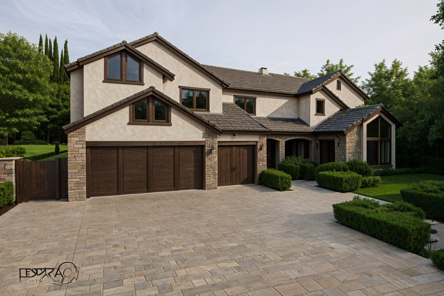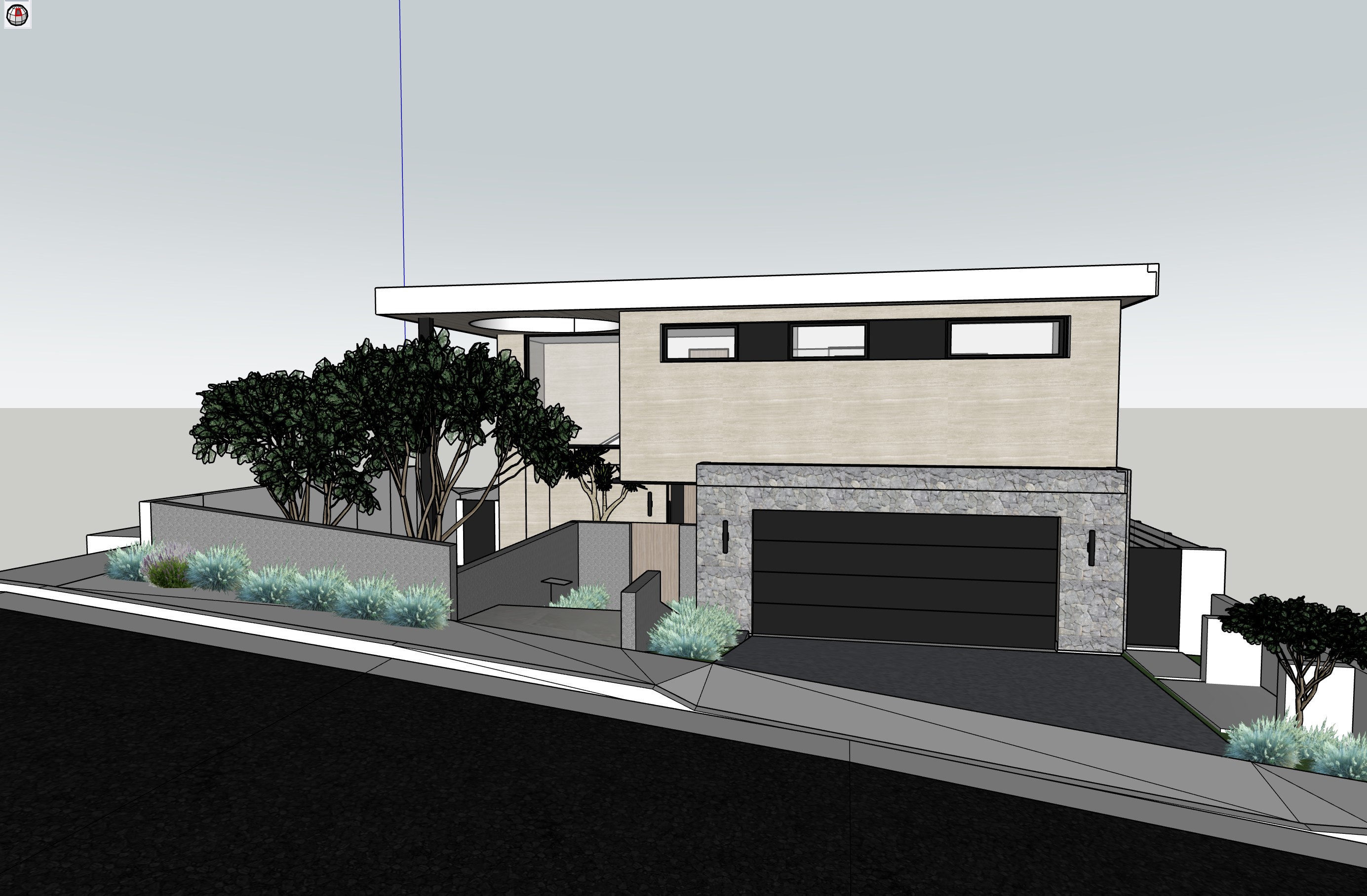 above the garage is trvertine the white is smooth white stucco it is over looking the ocean so make ocean in the background
