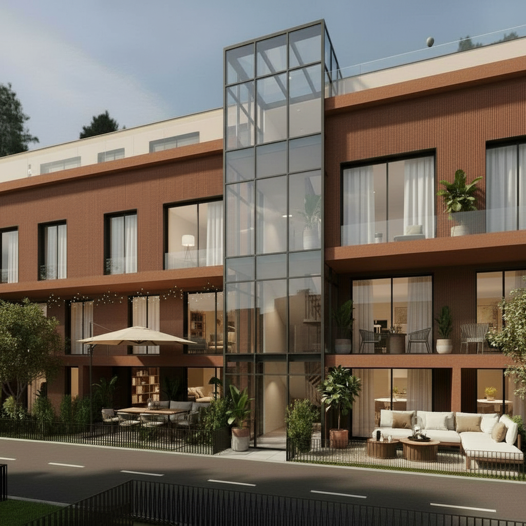 add blacked out glass facade on top of the entrance between the apartment blocks