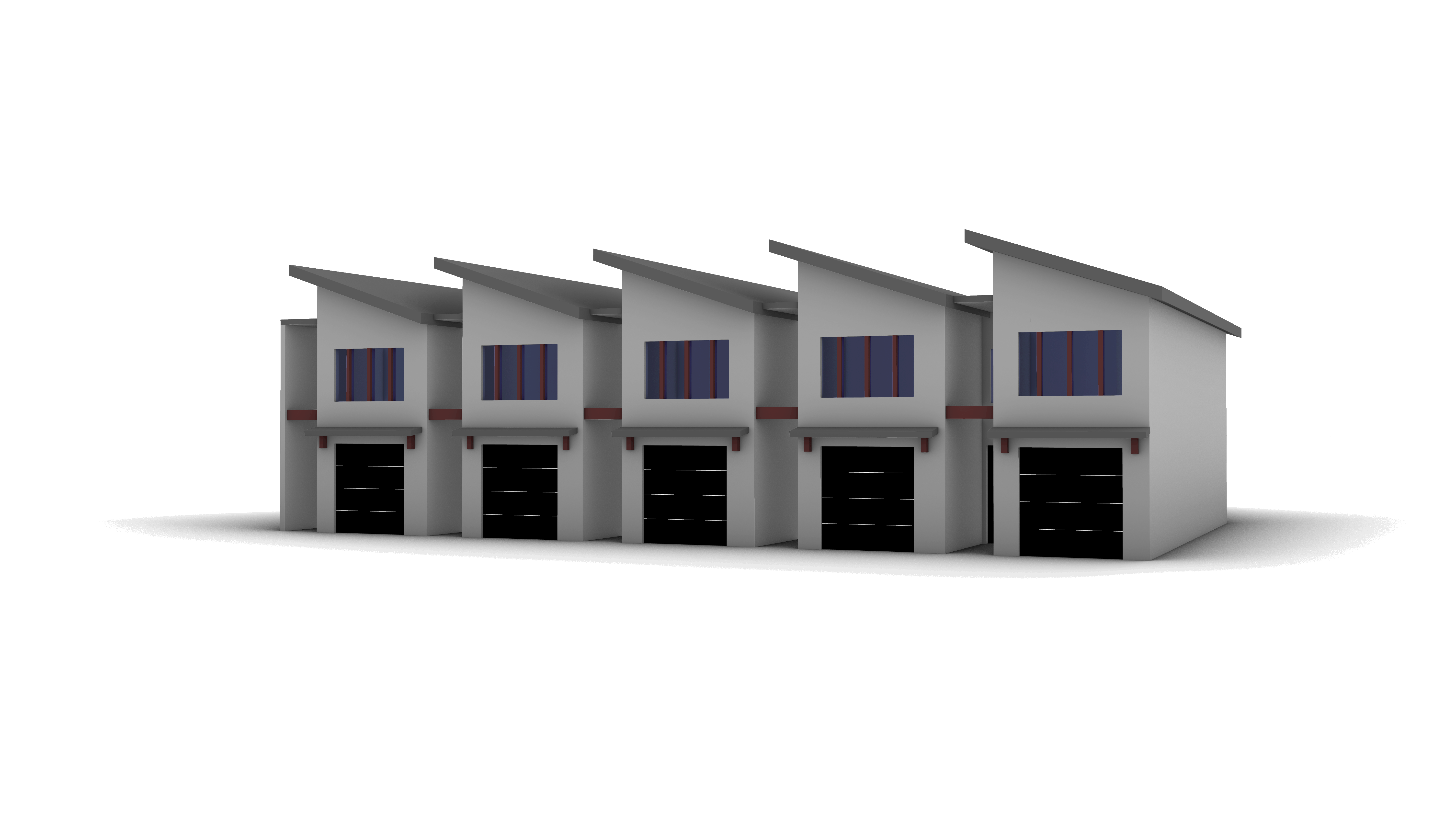 render this townhome building in a west coast modern style keeping all existing geometry and proportions exactly as shown use a rich yet balanced material palette featuring dark metal panels smooth fiber cement or stucco in warm grey tones and moderate accents of natural wood such as vertical cedar cladding or soffit details to introduce warmth each vertical roof segment should read as a distinct unit by subtly varying the material combinations alternate between darker metal lighter grey panels and wood tones for contrast and rhythm the large doors on the lower level are garage doors and should appear as modern dark aluminum or composite panel styles not wood include black framed windows clean detailing and restrained trim lighting should be soft and natural to highlight textures and shadow lines the surrounding landscape should be minimalist and modern with low plantings and concrete or paver walkways consistent with west coast modern design