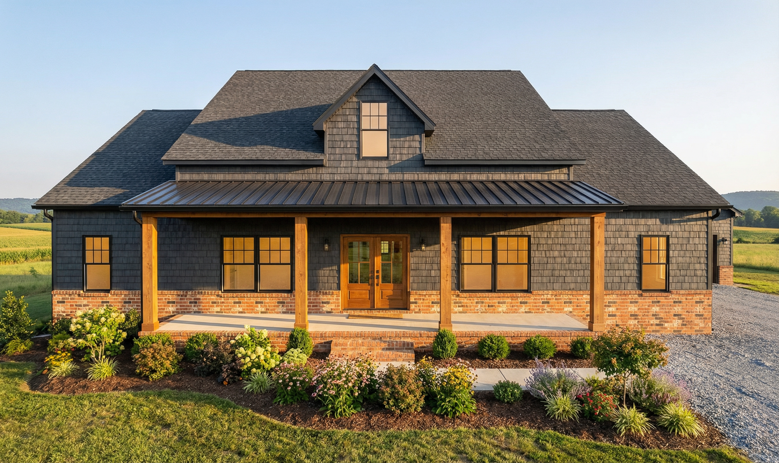 a modern two story house with a sleek design featuring medium taupe siding dark taupe trim the roof is a dark charcoal color adding contrast stone to be dark of dark earthy tones large windows dominate the facade reflecting the clear blue sky the front door is brushed steel with a frosted glass panel for sophistication the garage doors are cherry wood with contemporary glass inserts in upper row only surrounding the house a lush green lawn with colorful flower beds in shades of pink lavender and yellow the atmosphere is serene and welcoming with soft sunlight casting gentle shadows