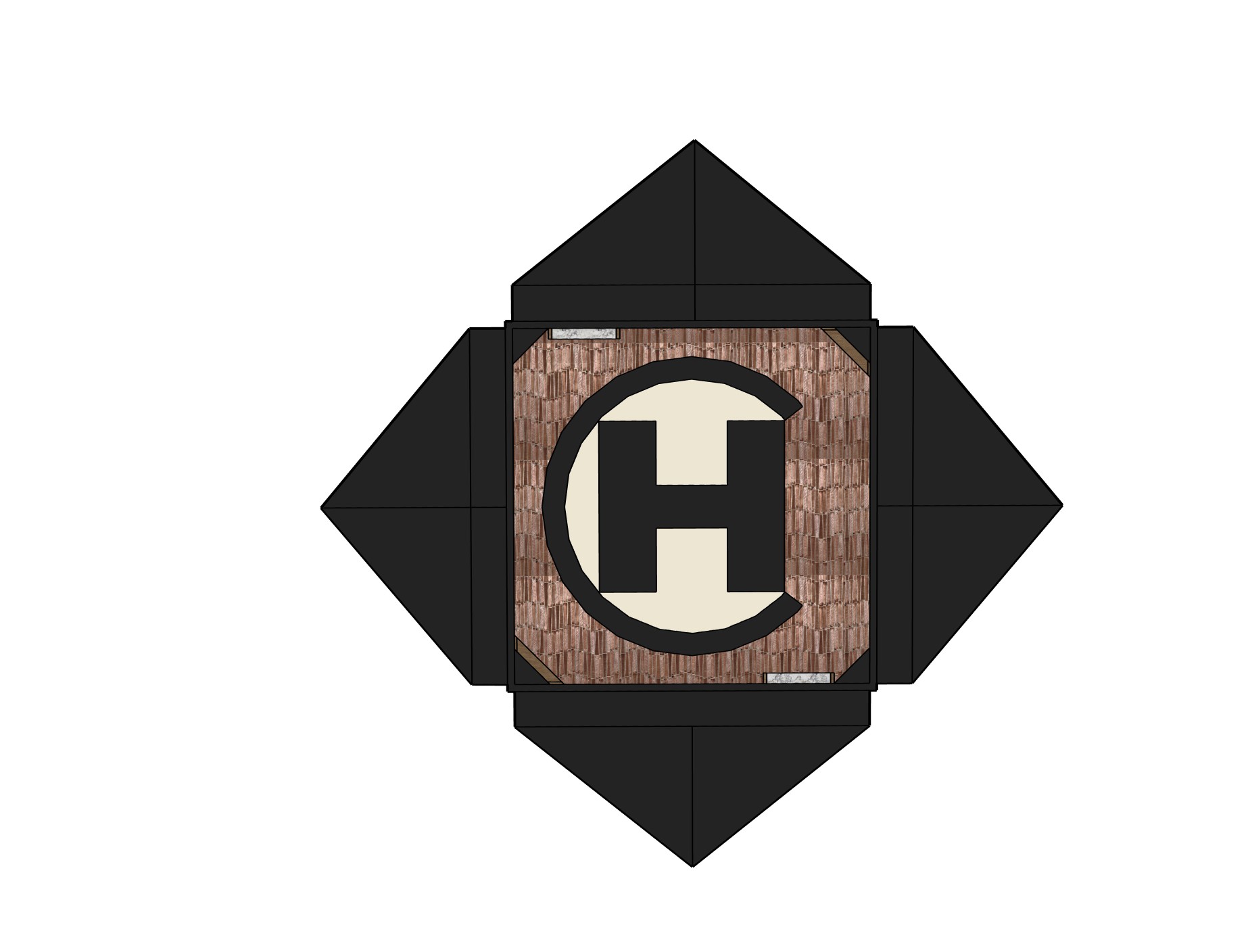 exterior shot keep all dimensions and materials accurate to the original image the flooring is a copper metallic mosaic tile the roof should be painted black the background should look like the arial view of a large shopping mall will people walking by