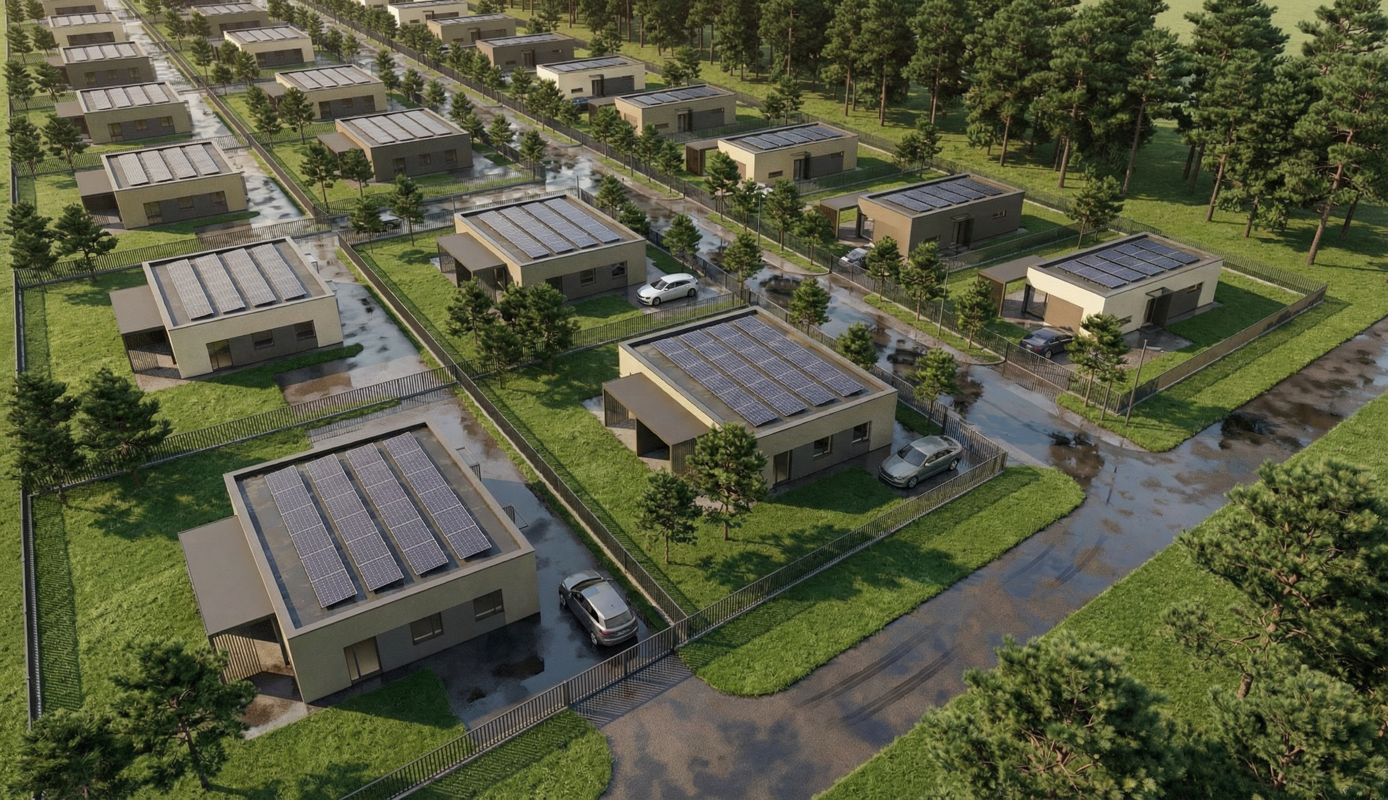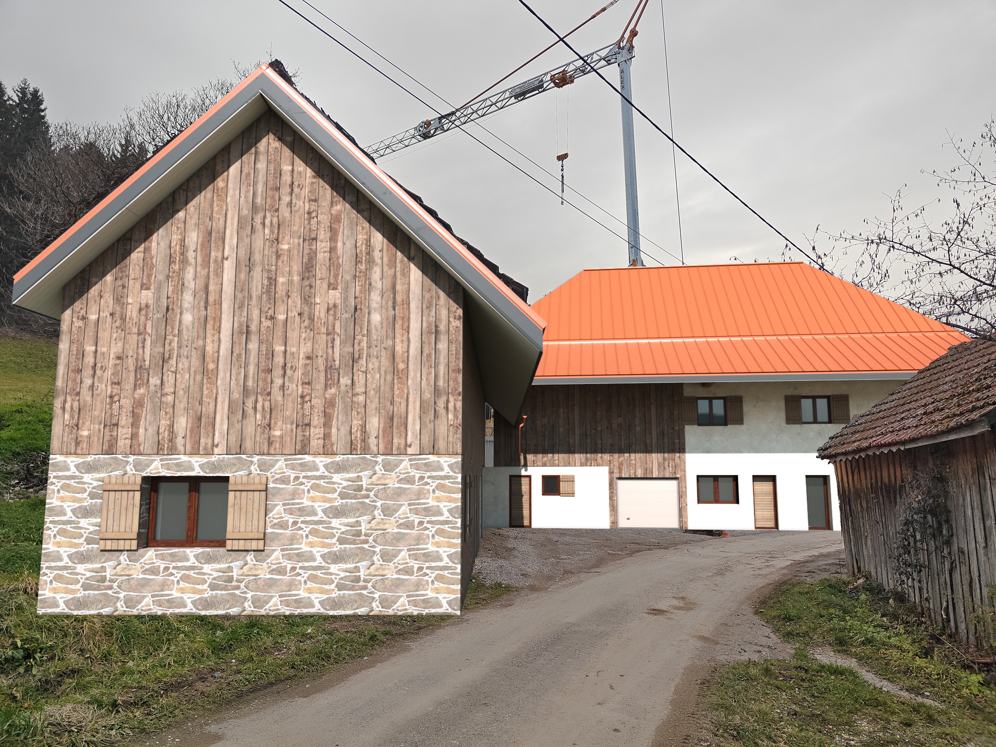 integrate the house realistically add grass where there are grass joints put in a blue sky with a few clouds remove the crane and construction elements keep the road as it is the grass is wild and medium height remove the branches on the right
