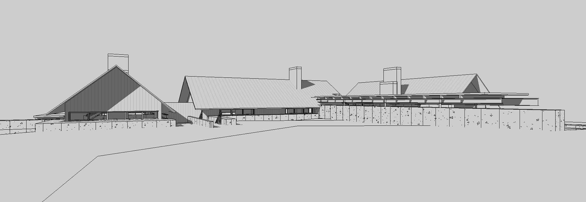 corten steel panels rustic wood shiplap siding concrete accent walls sunlight on building face tall grass in foreground fog trees in background