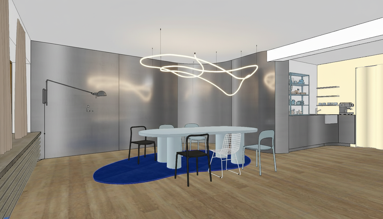 add a centered kitchen island with a white quartz countertop with a waterfall edge on the right and full cabinets underneath using the reference image as a basis