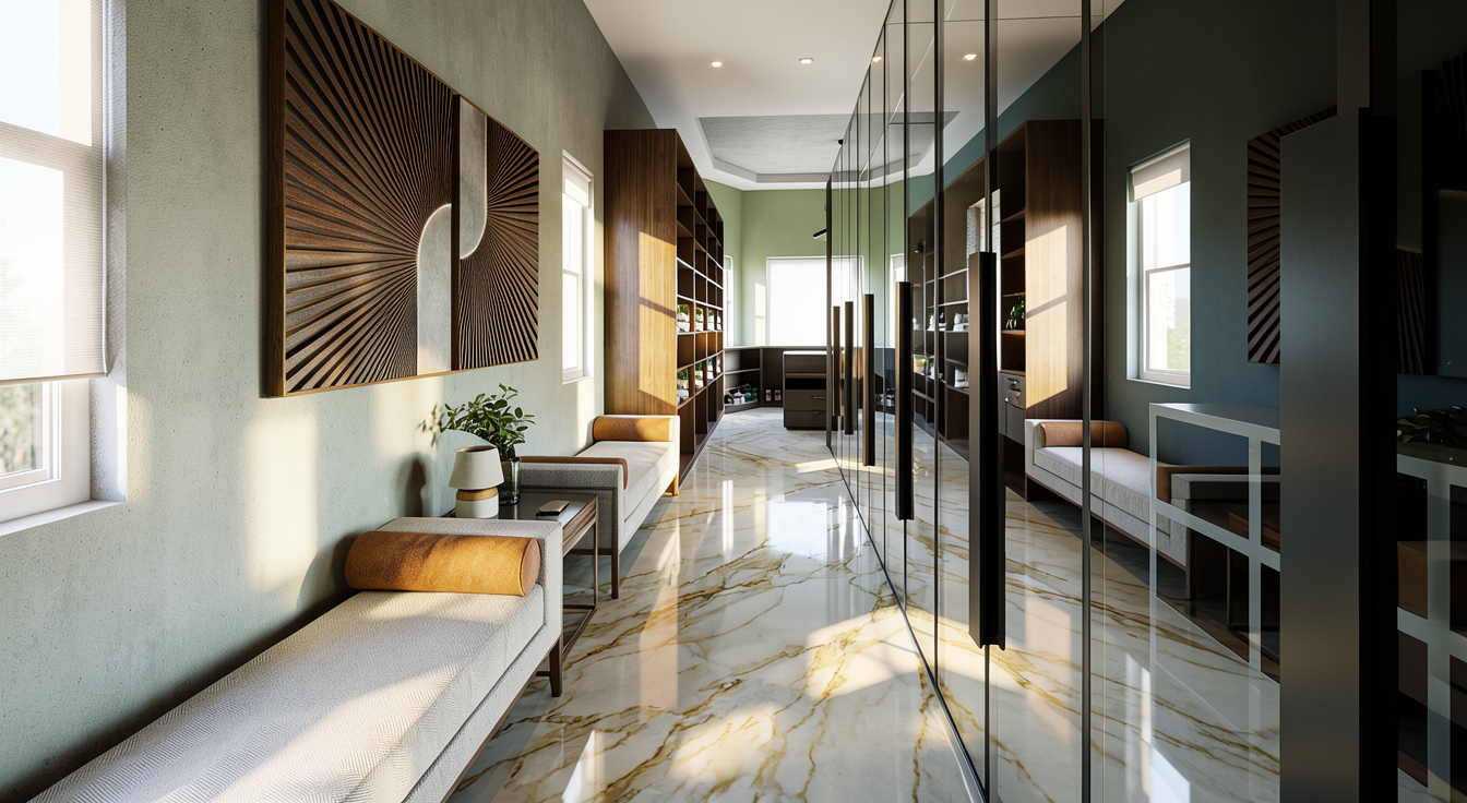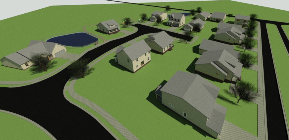 aerial view of a serene suburban neighborhood featuring neatly aligned modern houses with light beige exteriors and dark grey roofs the asphalt roads are deep black and freshly paved bordered by wide clean sidewalks in a subtle grey tone the landscape is lush and vibrant with a well maintained grassy terrain in a rich green color dotted with tall leafy trees casting gentle shadows in the distance a calming pond with clear reflective water in shades of deep blue adds a tranquil touch the atmosphere is peaceful and inviting reminiscent of a sunny clear day the sky overhead is a bright cloudless blue illuminating the scene with warm natural light
