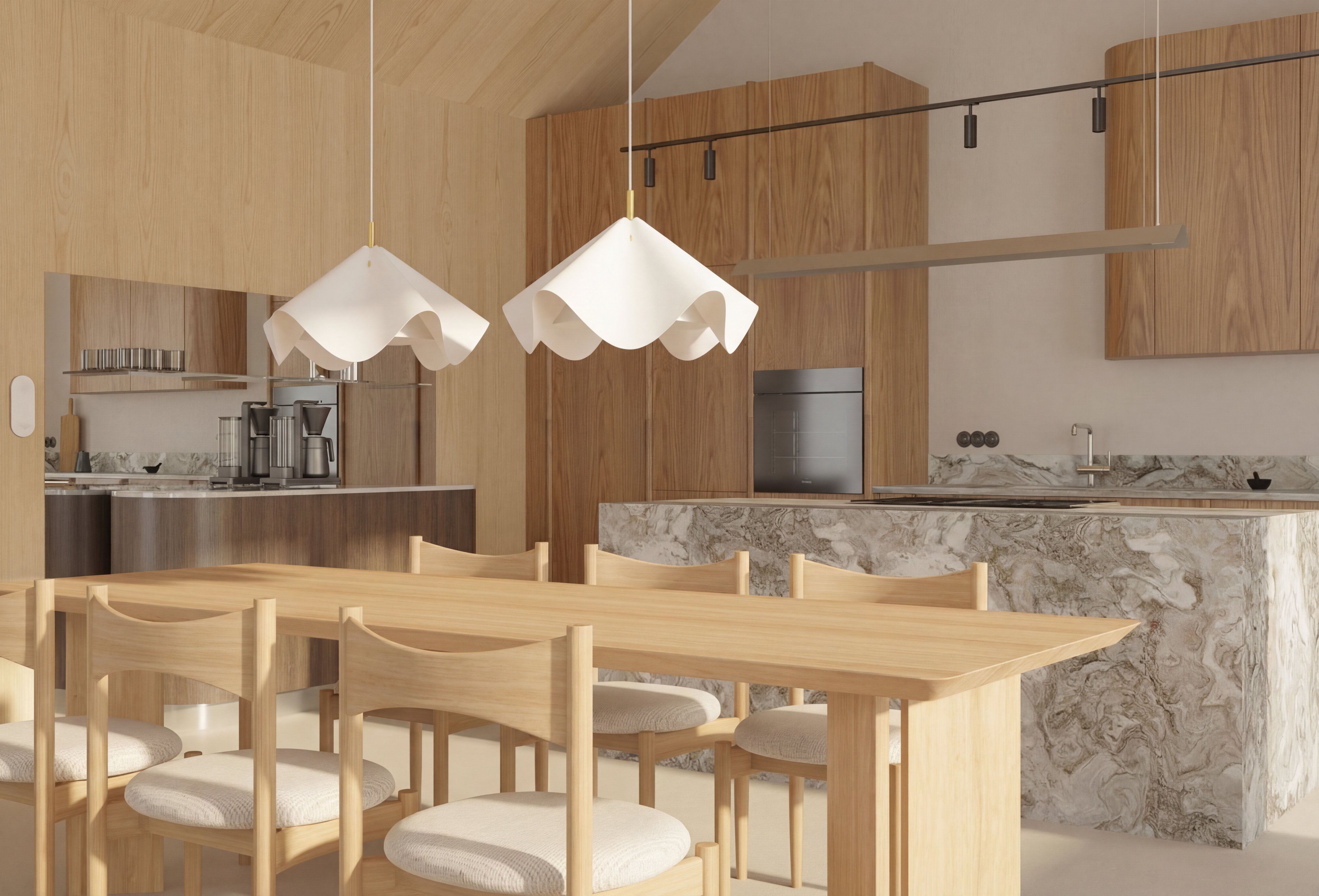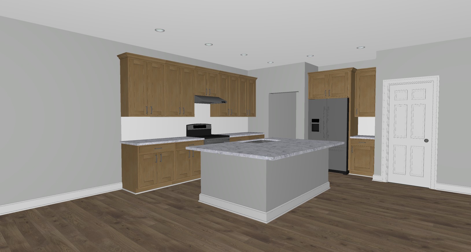 render a photorealistic modern kitchen interior with a cozy and inviting atmosphere features wooden cabinets in a dark gray with warm undertones with satin nickel cabinet hardware with an artic white 3 in wide by 12 in height picket undulated tile backsplash with snow white grout and countertops highlight the sleek stainless appliances and countertop to be dawn mist granite stainless steel undermount double bowl sink with a delta westville single handle pull down kitchen faucet in artic stainless walls in a soft grey e0e2e0 ceiling in a white f7f7f1 base board in a white f7f7f1 show molding in a white f7f7f1 doors in a white f7f7f1 door hardware to be a satin nickel add floor elmwood smoke lvt in a soft cool gray brown cast and a more weathered look than the warmer oak visuals add three one light pendants with a slender design that complements mid century modern transitional and contemporary settings with a simple round canopy suspended over a cylindrical clear glass shade over the island in matte black measures 4 in diameter by 9 75 in height use a warm ambient lighting in the can lights show use a soft ambient lighting to enhance the warm atmosphere color scheme