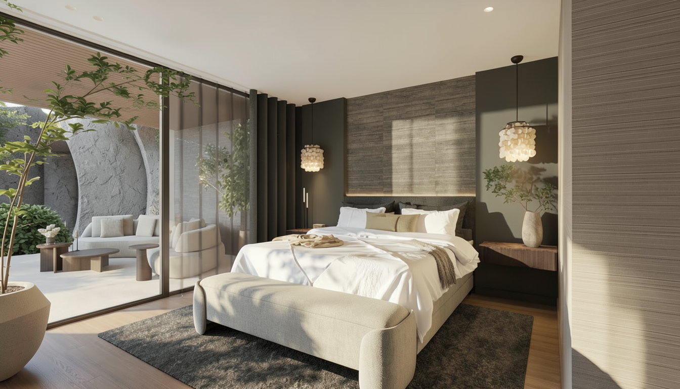 a hyper realistic high resolution architectural rendering based exactly on the architectural geometry and structure of the shown house shown the architecture of the house must remain unchanged the perspective should match the original image inside the house multiple rooms are visible illuminated by warm inviting light all interior furniture including living room sets dining tables and light fixtures is clearly visible without any curtains or window treatments and is perfectly scaled and proportional to the architectural spaces in the foreground on a paved patio a stylish set of modern garden furniture is arranged including a large modular outdoor sofa and a dining area complemented by a lit fire pit warm string bistro lights are draped across the scene enhancing the cozy and welcoming atmosphere the landscaping is lush and detailed with native plants and trees the overall style is sophisticated photorealistic architectural photography with cinematic lighting