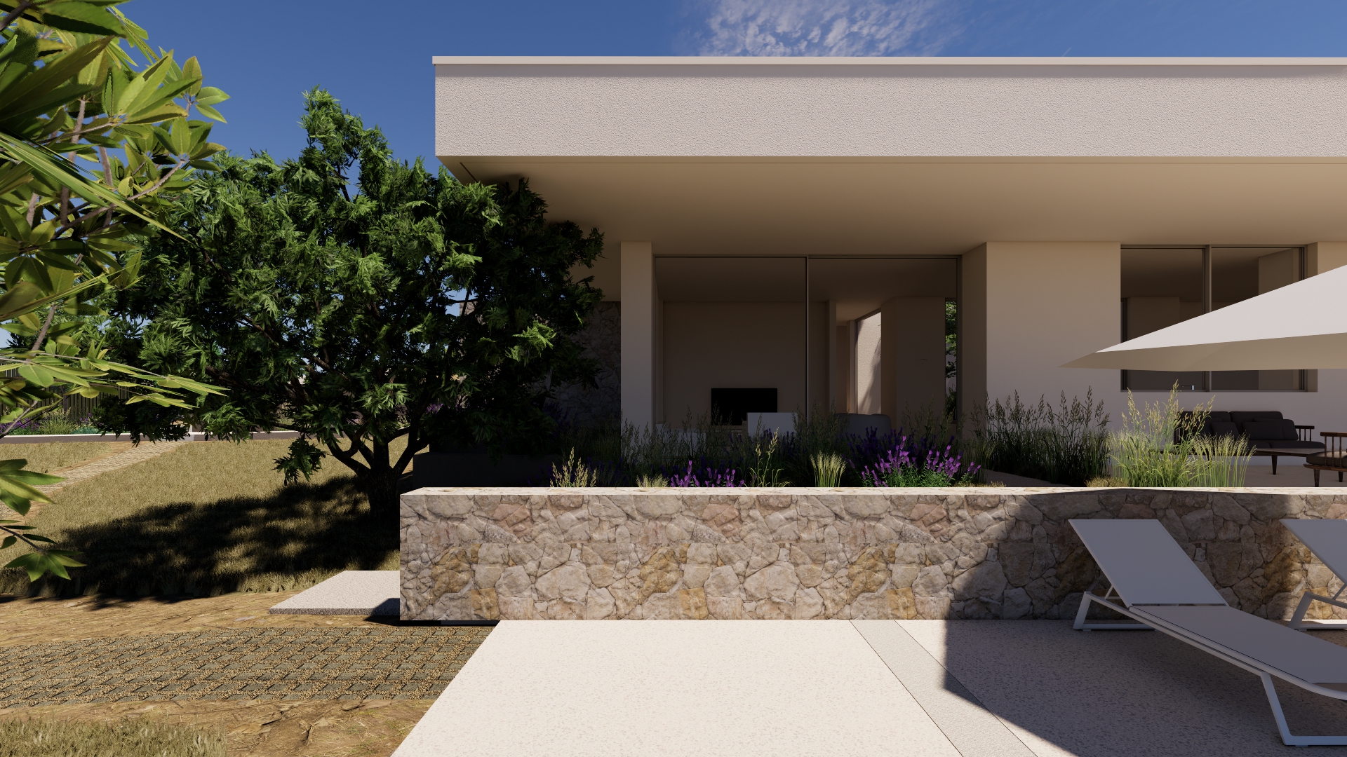 villa in a plot with many olive trees low bushes and levander make the outdoor floor more natural and the sun more sweet like an afternoon shot architecture