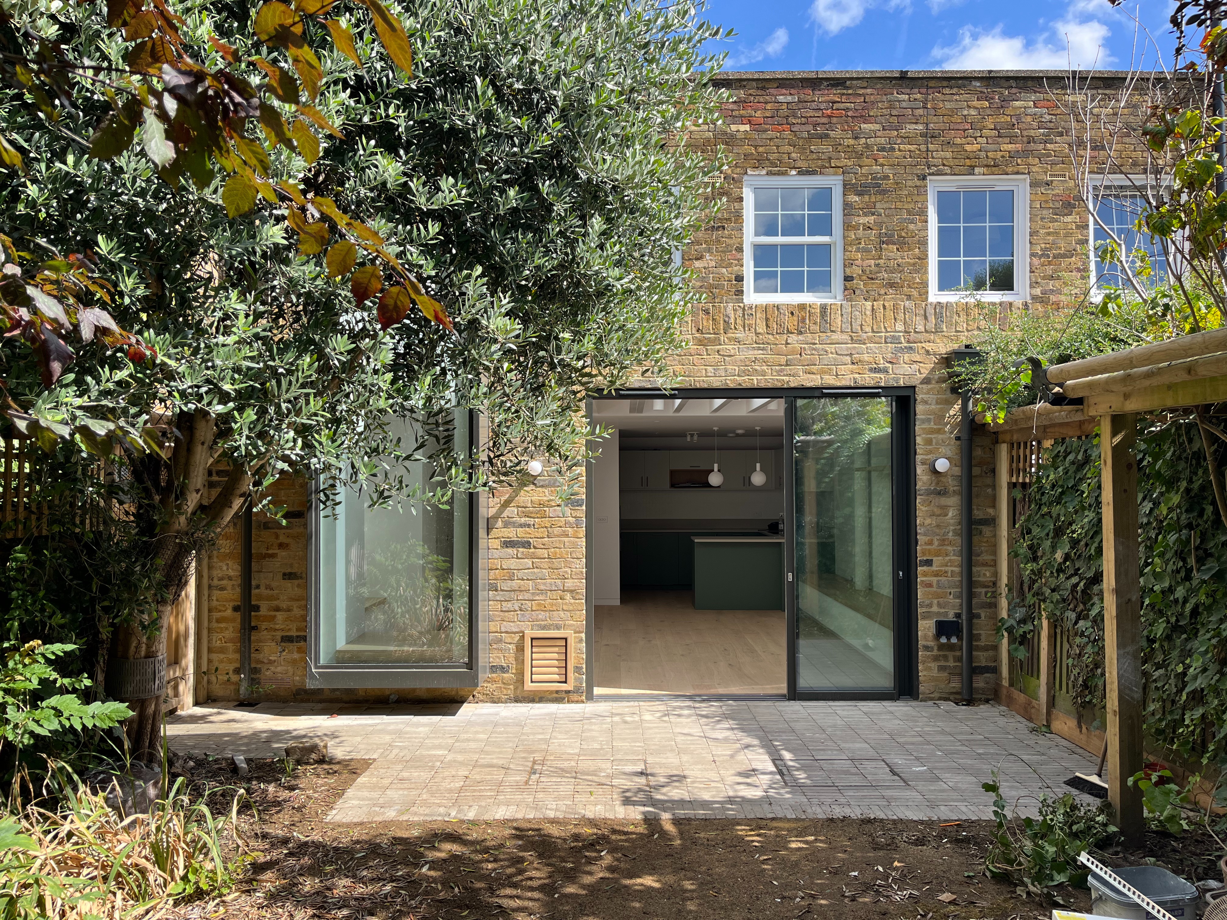 remove cat flap and replace with brick add short tame grass to replace muddy areas add climbing plants to fence and remove any visible timber in fence area change the weather and atmosphere to a sunny day in january