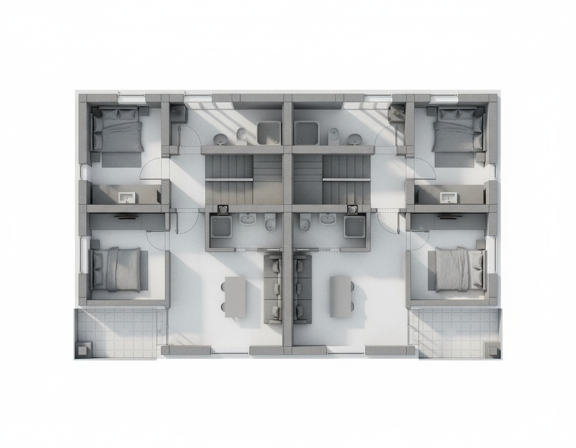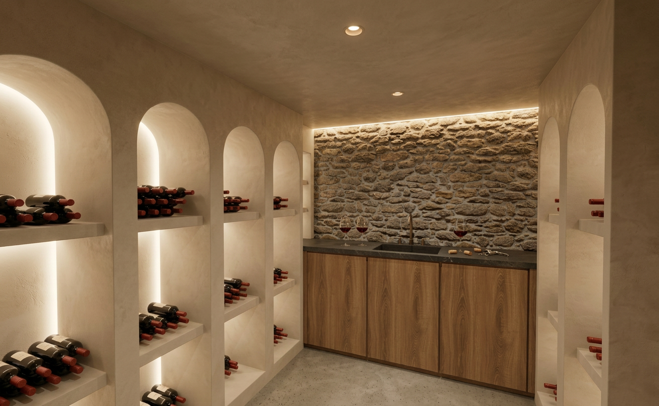 enhance the scene by keeping the same lighting as the other view but make the light warmer with more orange and yellow tones and less white add a led strip along the top of the stone wall place wine glasses with wine and a corkscrew naturally on the countertop integrate the sink seamlessly into the stone countertop add a human silhouette in the scene for a sense of scale and life make the cabinetry a slightly lighter wood with more attractive grain patterns maintain the minimalist and bright atmosphere of the room