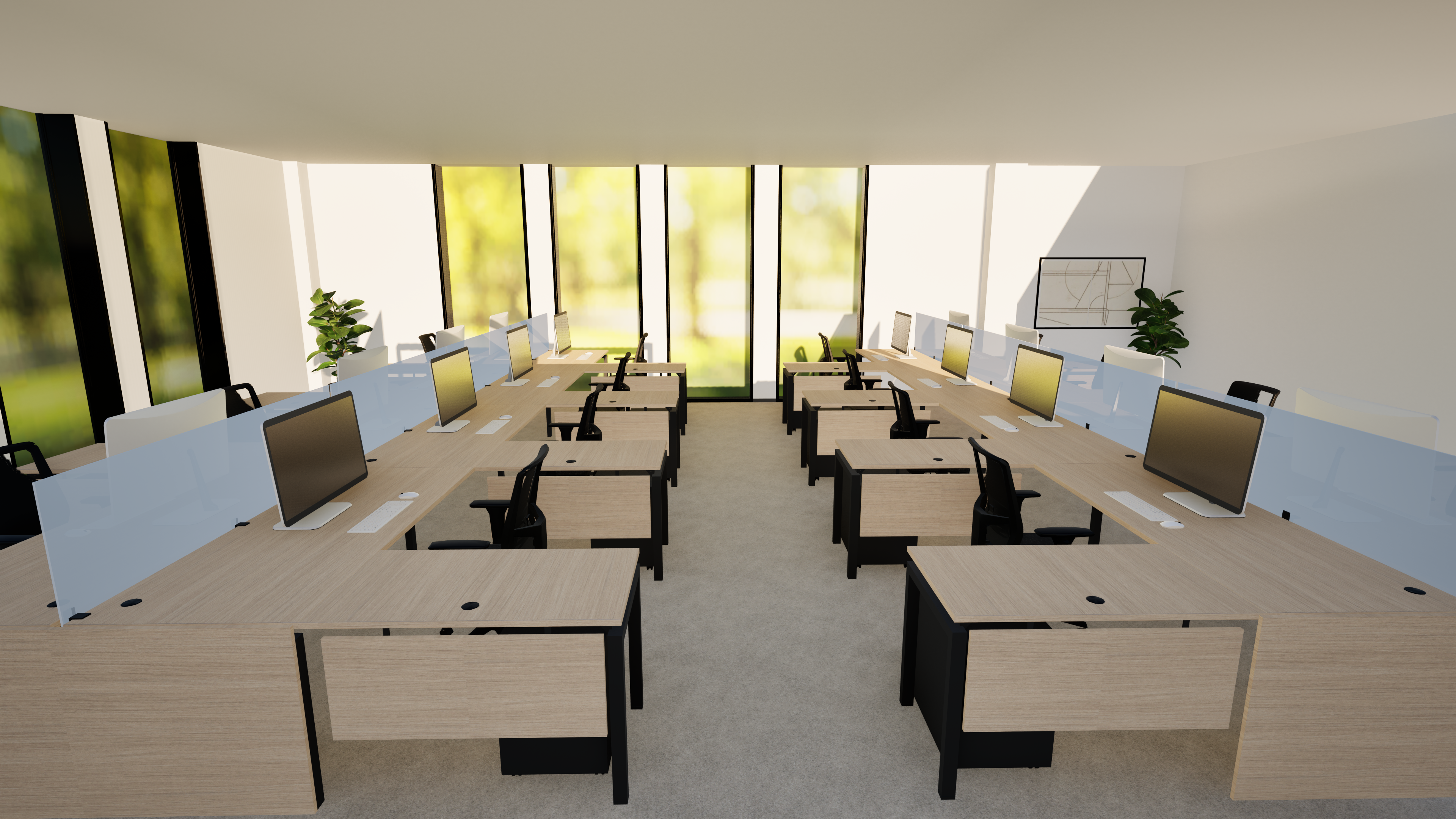 make more realistic by adding light fixtures and correcting the lighting keep all furniture and colors the same add decor add office workers