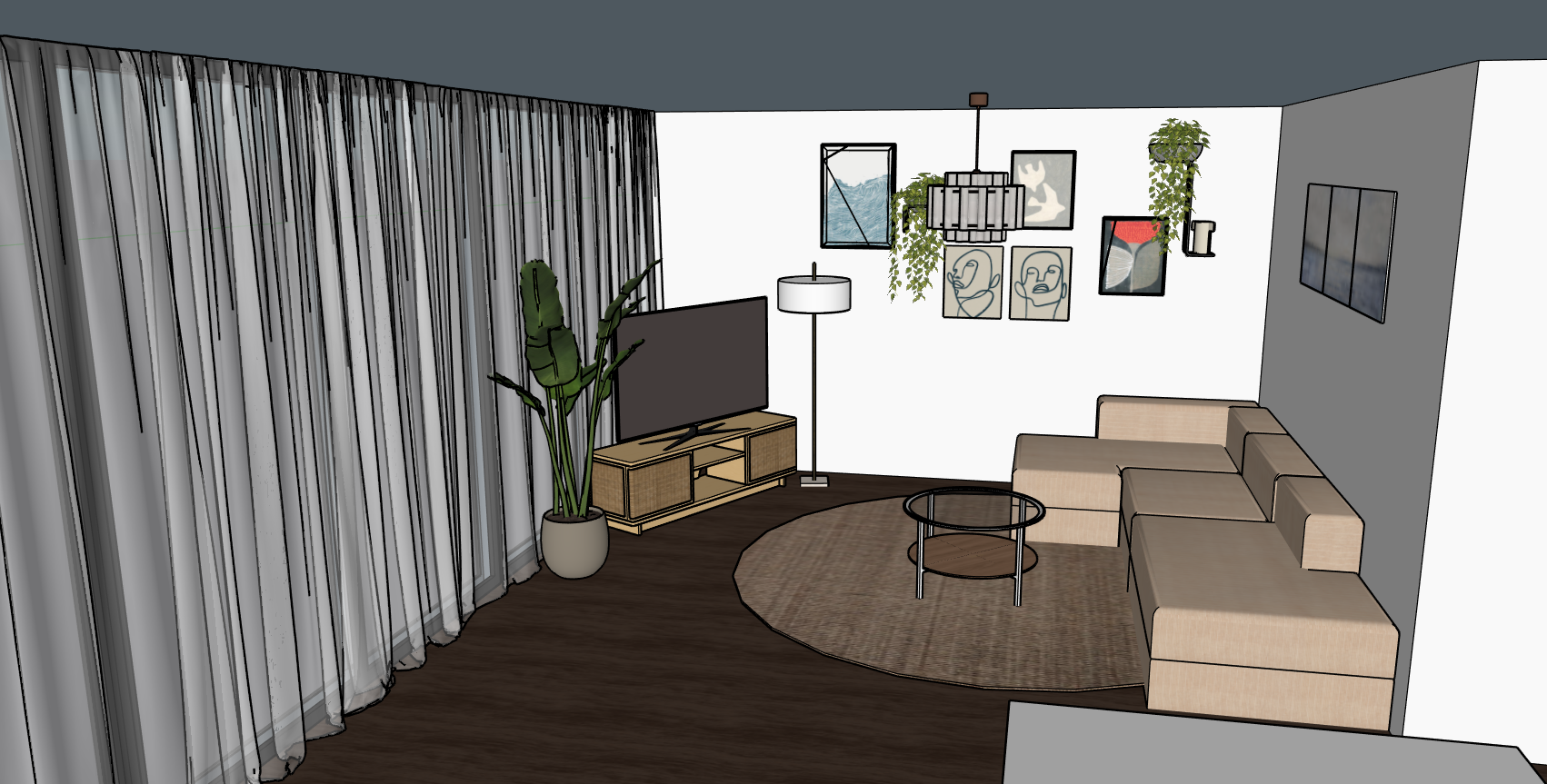 make this sketchup screenshot look like a realistic photo with photorealistic textures and nice moody lighting and natural light from behind the transparent curtains