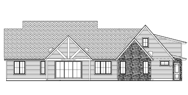 show the image as a real image with a sunset backdrop in a field with moderate amount of trees the horizontal lap siding should be james hardie brands rich espresso color the stone on the house should be el dorado brand cut coarse stone in their seashell color this is a backyard so show a cement patio include a black pergola outside the house centered around the fourth window from the left of the building show a backyard landscape in front of the building