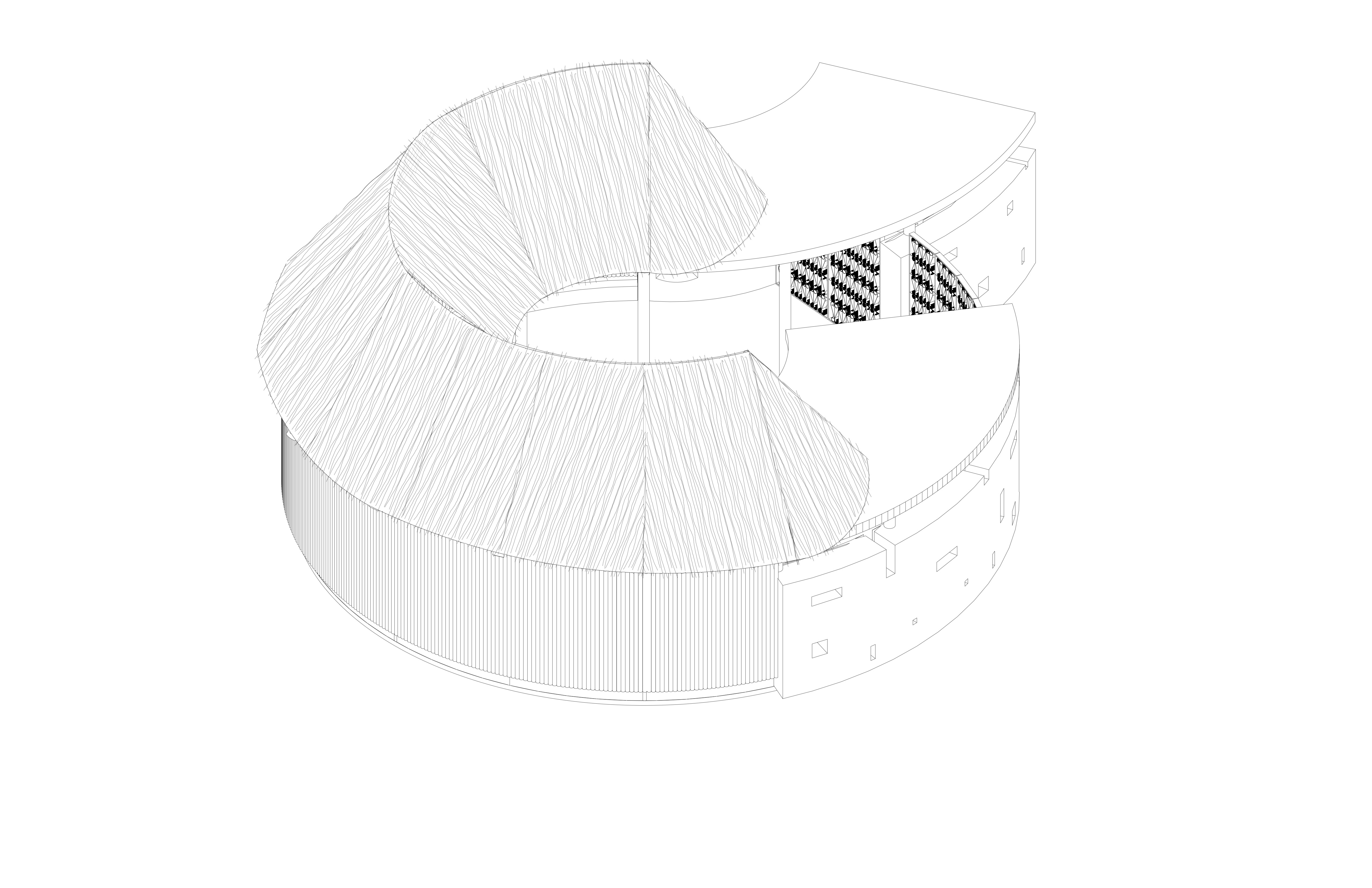 the architectural model is mounted on a base made of the same material and is accompanied by small miniature trees placed on both sides providing scale and context the background is neutral and gray typical of a studio photograph for architectural models the model itself is crafted from materials resembling balsa wood or kraft cardboard round base