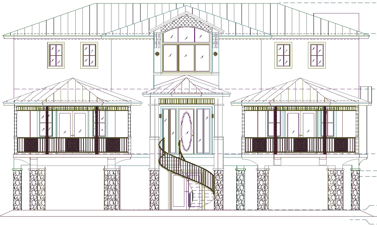 need to render this elevation make house creamy white with black framed windows and doors no mullions make roof white metal and add accent color or green grey have the landscaping be tropical with an ocean view from back of house make railings black and elevated columns under house to be black pebble