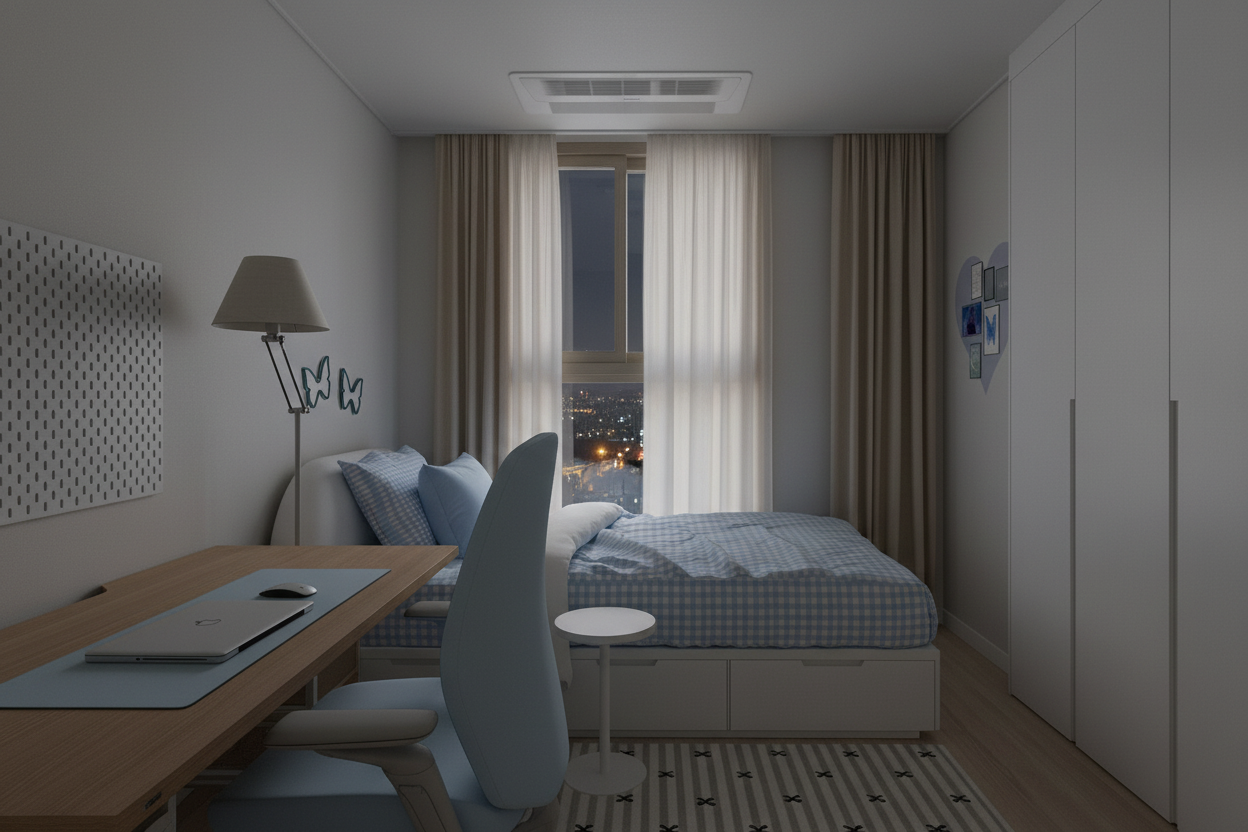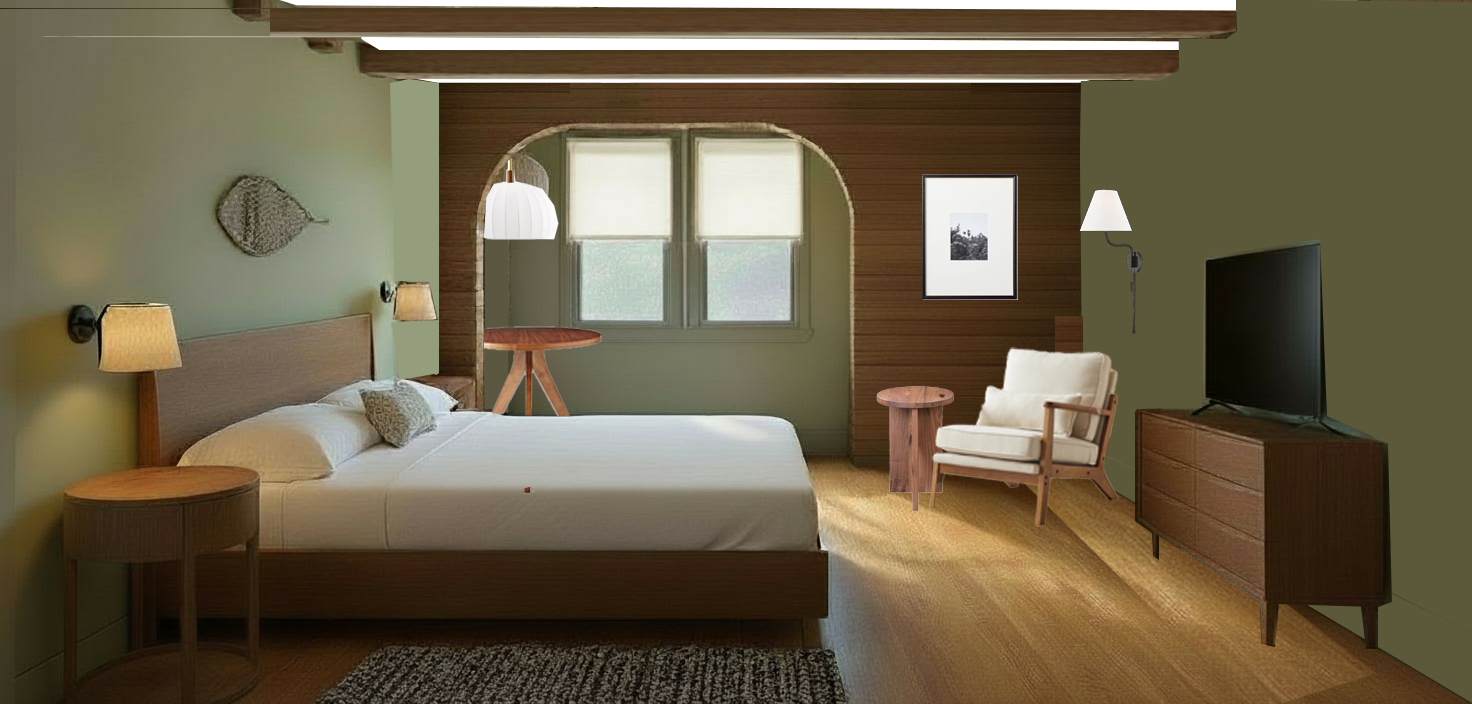 render a cozy bedroom with a warm inviting atmosphere the walls are a soft olive green creating a soothing backdrop the floor features natural wooden planks that add rustic charm the bed is adorned with crisp white sheets and earthy brown pillows complementing the hardwood frame the room includes a wooden side table with a warm brown finish and a cylindrical table with rich walnut tones a cushioned armchair in a soft cream color provides comfort the ceiling features exposed wooden beams with subtle lighting enhancing the cozy ambiance a large window with sheer white blinds filters soft daylight illuminating the space the atmosphere is warm inviting and serene perfect for relaxation