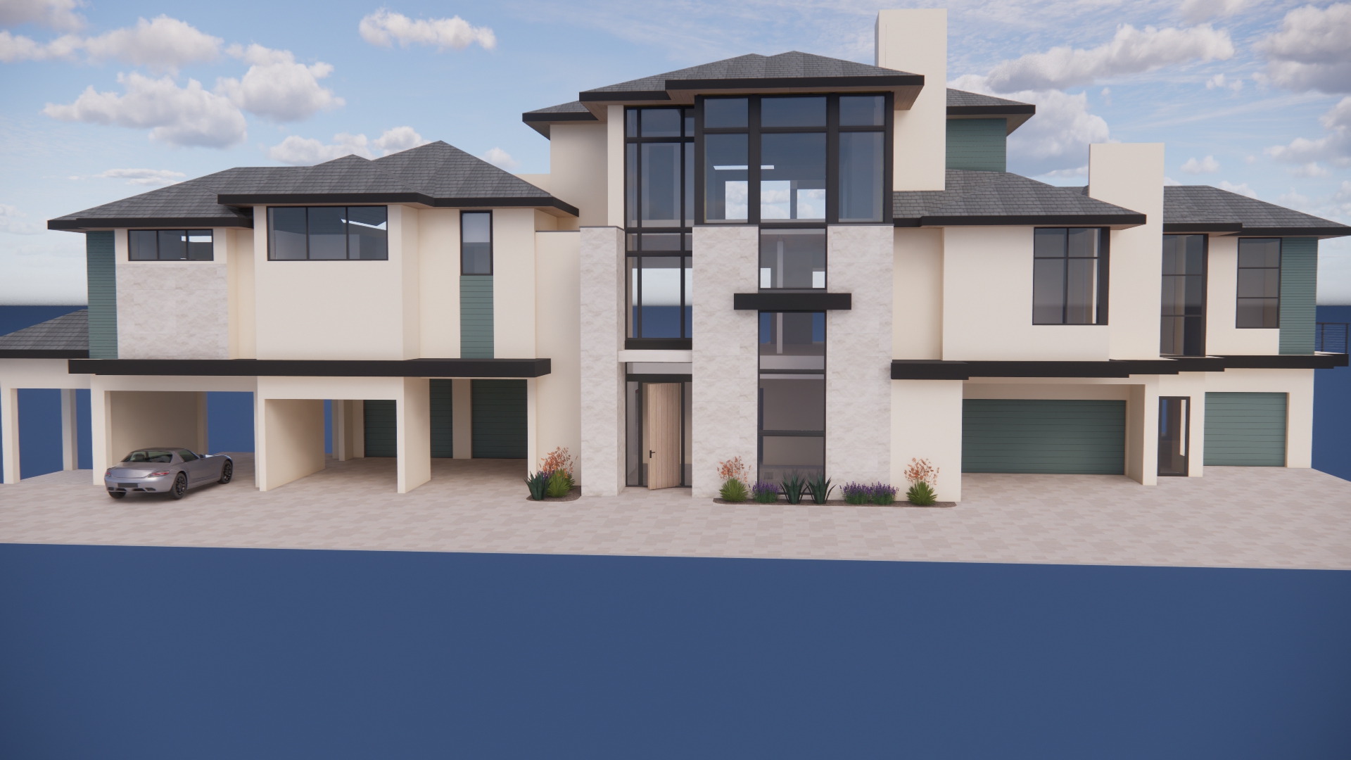 photo quality image with florida background include palm trees and tropical plants add grass in the foreground the scene is twilight with lots of accent lighting