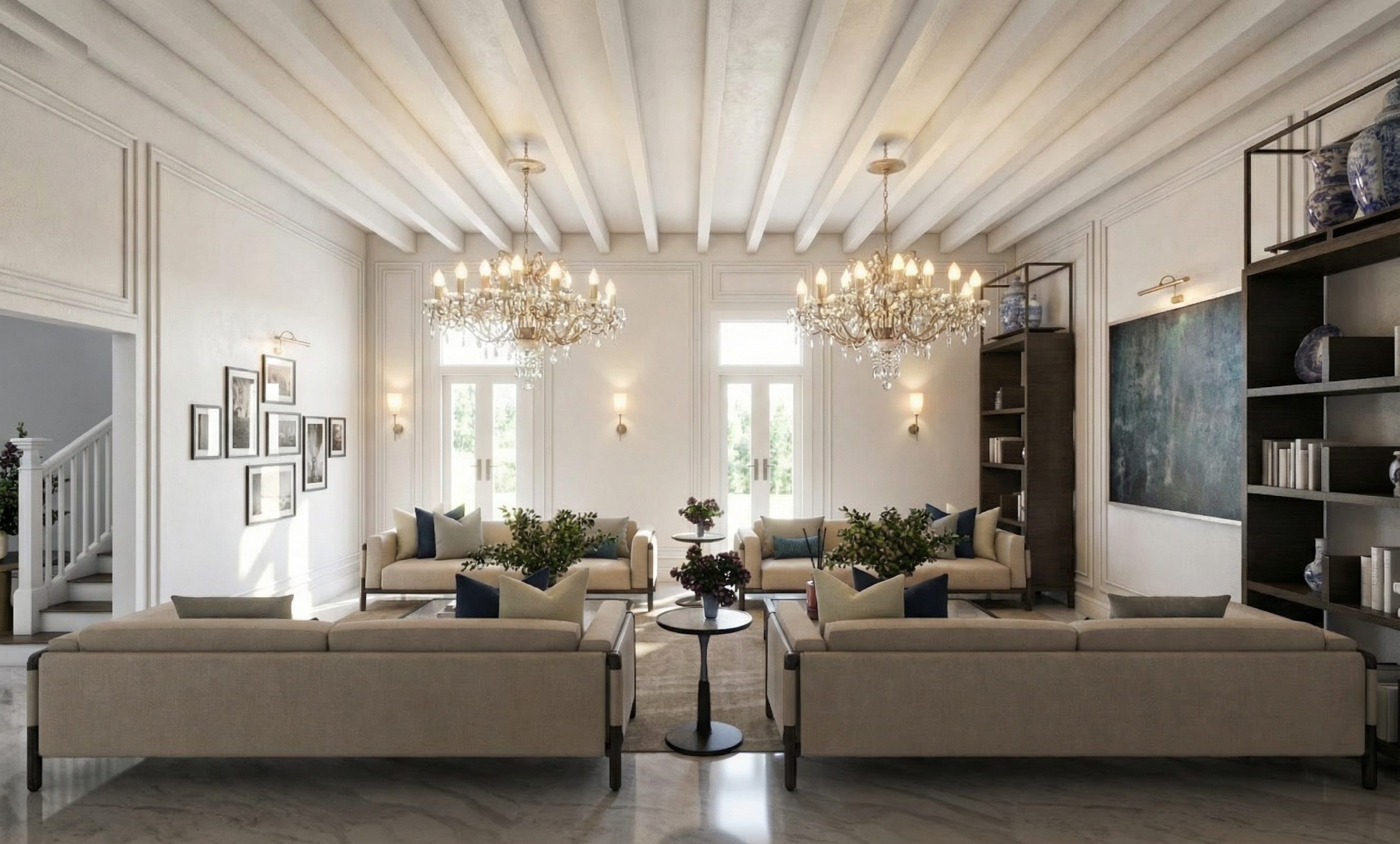 add finishes to this image similar to the reference image light oak wood warm interiors cabinetry on the right side to hang clothes
