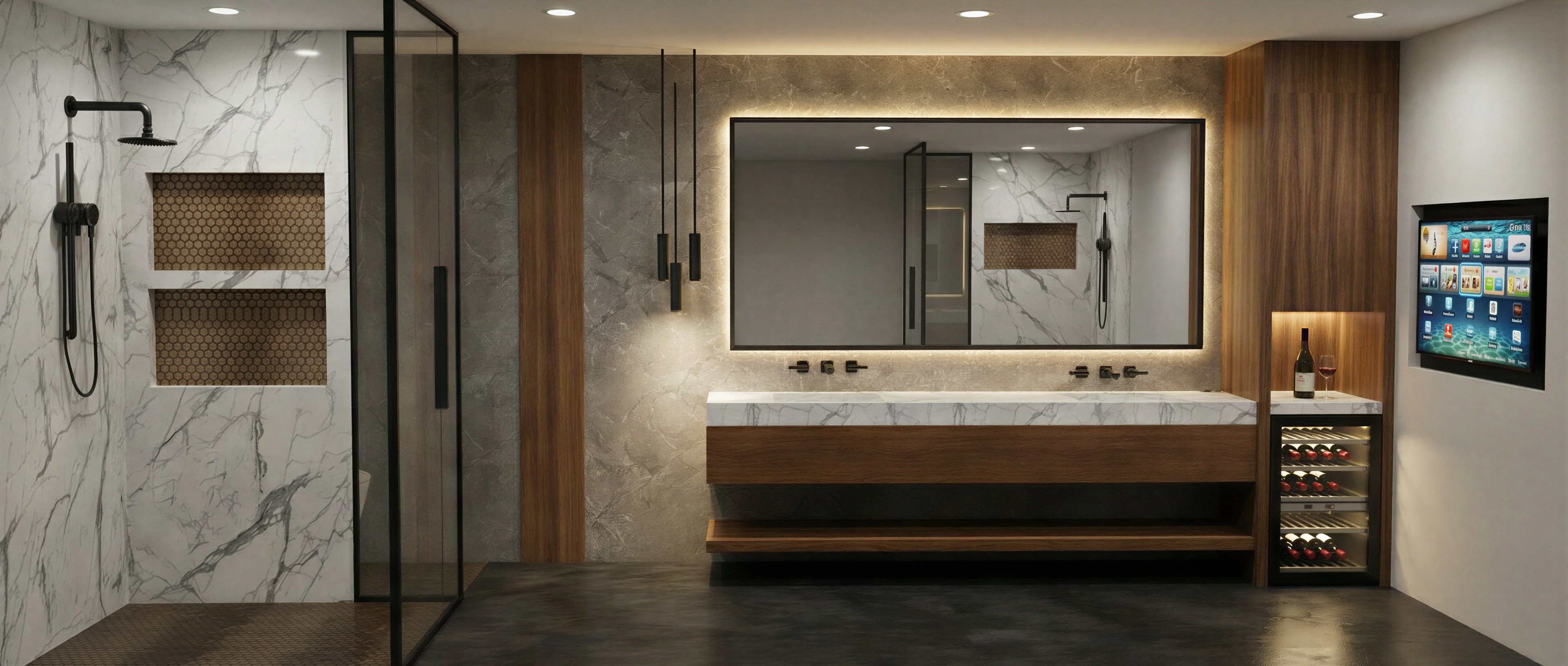 a luxury hotel room bathroom high end materials the cabinet with the wine is a light grey wood veneer the wall the tv is a crisp white paint the mirror reflects the white wall that is in front of it with a door