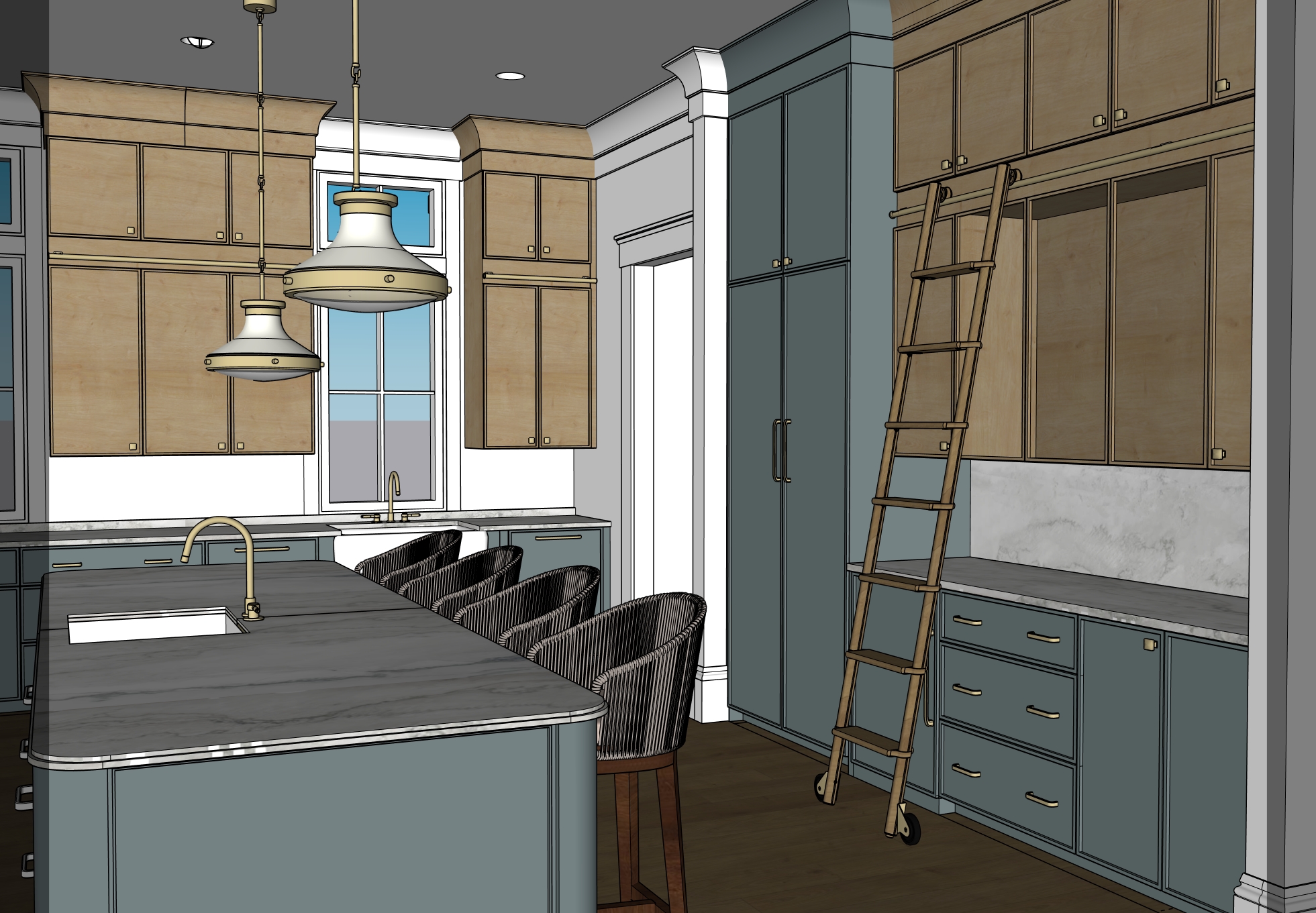 a modern kitchen interior with a warm and inviting atmosphere the cabinets are a light natural wood finish complementing the elegant gray blue color of the lower cabinetry the countertops are a luxurious grey quartzite providing a sophisticated contrast the floors should be white oak wood the wooden ladder is rich honey brown adding a rustic charm pendant lights are a soft cream casting a warm glow on the dark hardwood floors the window allows natural light to flood the room with a clear blue sky visible outside the room feels contemporary yet cozy with perfectly balanced colors and textures