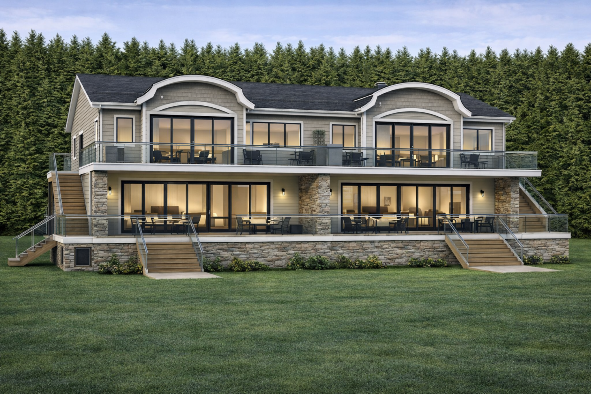 contemporary exterior shot this needs to look like 4 condos 2 on each side on top of each other i want to uses exterior finishing that would be less costly less expensive materials i want to keep the exterior roof shapes and feel this view is the water front view the condos entrances will appear on a different image on the other side of the building architecture
