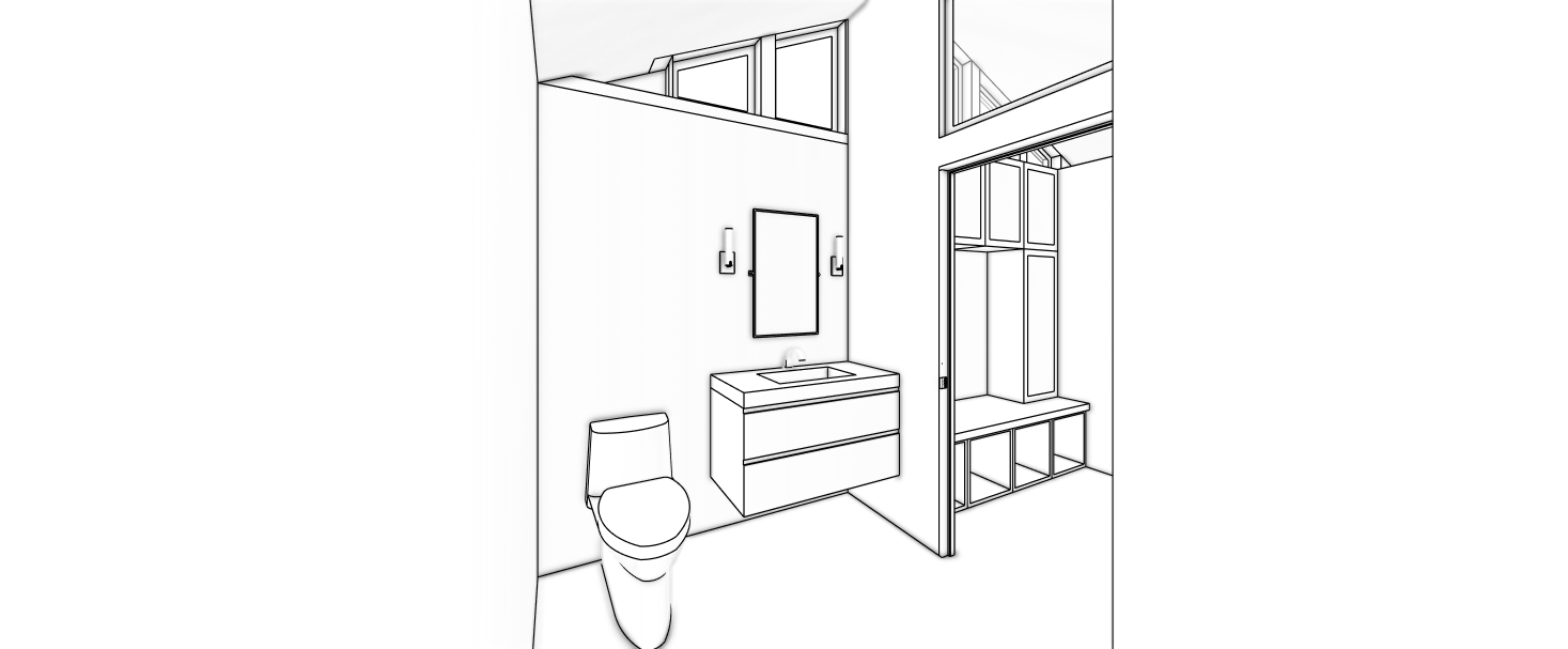 keep image of model as is soft even ambient lighting from the two lit sconces creating realistic but clean architectural shadows no harsh contrasts high key overall illumination with gentle gradients to define depth and material texture professional clean minimalist elevation style centered floating two drawer light wood vanity with thin brass gold horizontal bar pulls thick white countertop with integrated or undermount rectangular sink wall mounted black matte faucet with cross handles large rectangular mirror centered above the vanity reflecting part of the opposite wall and ceiling two identical modern pendant lights with black cords and large spherical white glass globes hanging symmetrically on either side of the mirror full height backsplash of small square ceramic tiles approximately 2x2 or 3x3 in a light tone shown with clean white grout lines and subtle texture via light gray shading small white hexagonal mosaic tiles with white grout flooring ceiling with exposed light wood planks with visible grain and beams walls painted light gray or off white