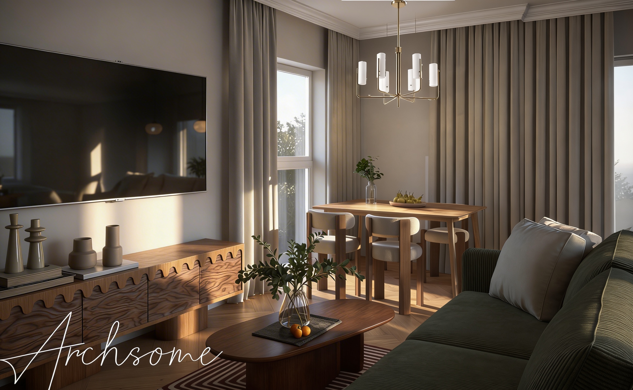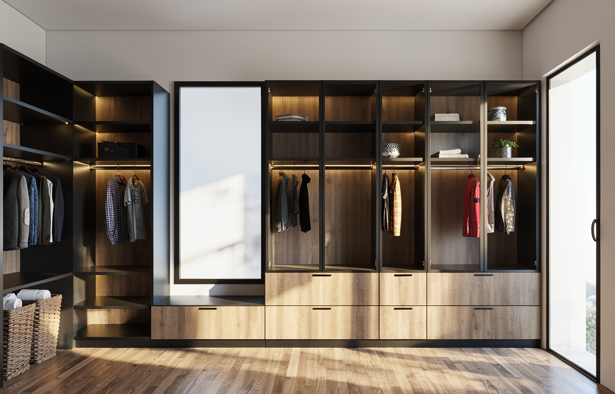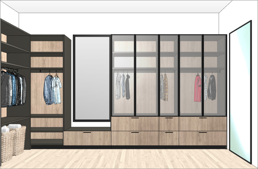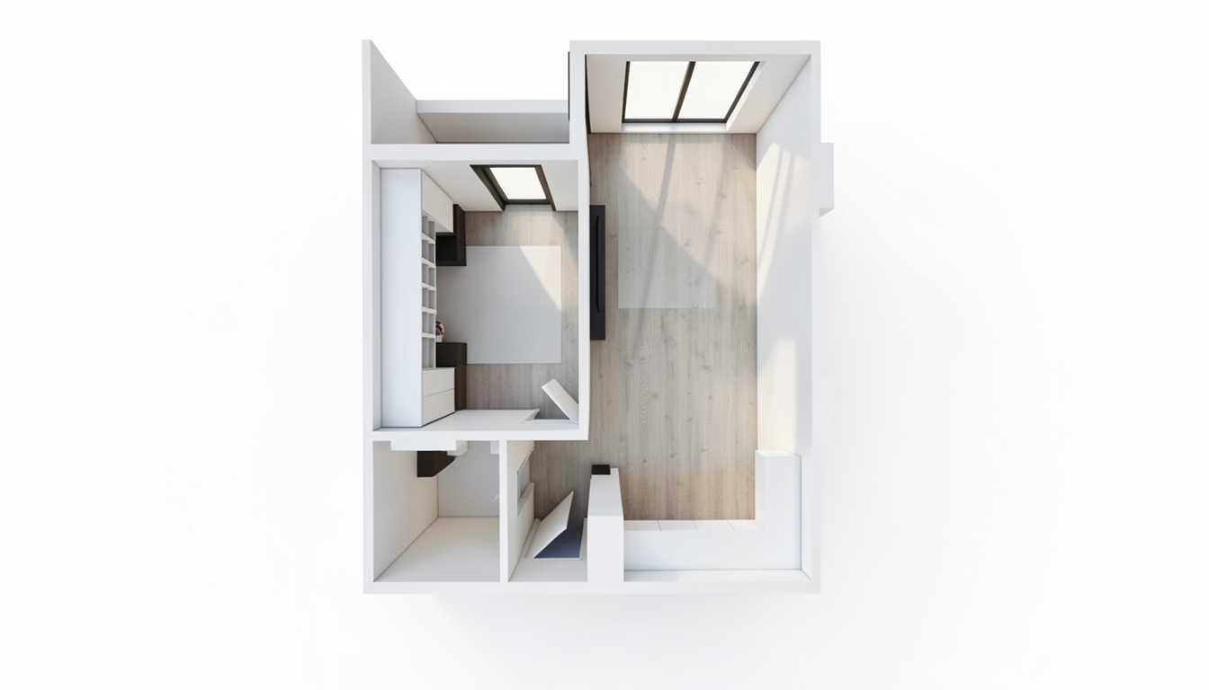 the blue ish surface on the right is a mirror the opening on the long wall is a window with a view from a second floor
