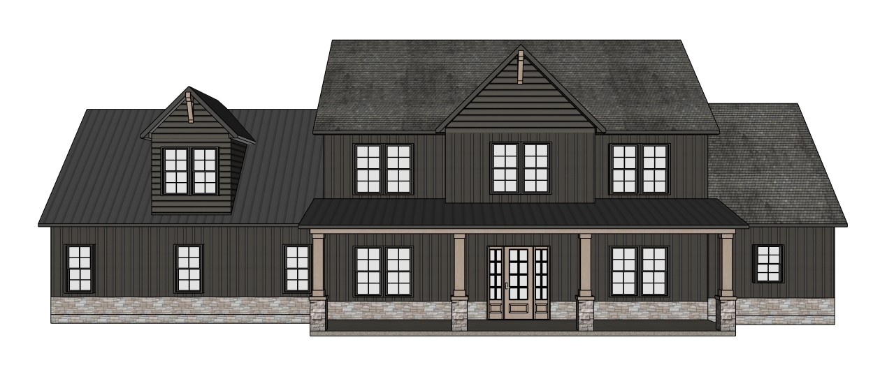 create a beautiful rendering of a modern farmhouse with a dramatic dark charcoal exterior the main structure is accented with light gray stone on the lower portion creating a contrast against the dark siding the roof features a sleek dark metal design on the porch with shingles on the other roofs the windows and doors have a crisp black trim adding brightness and definition the porch columns are warm beige complementing the earthy tones of the stone base surround the house with lush green landscaping and set it under a partly cloudy sky with soft warm lighting to enhance the welcoming atmosphere
