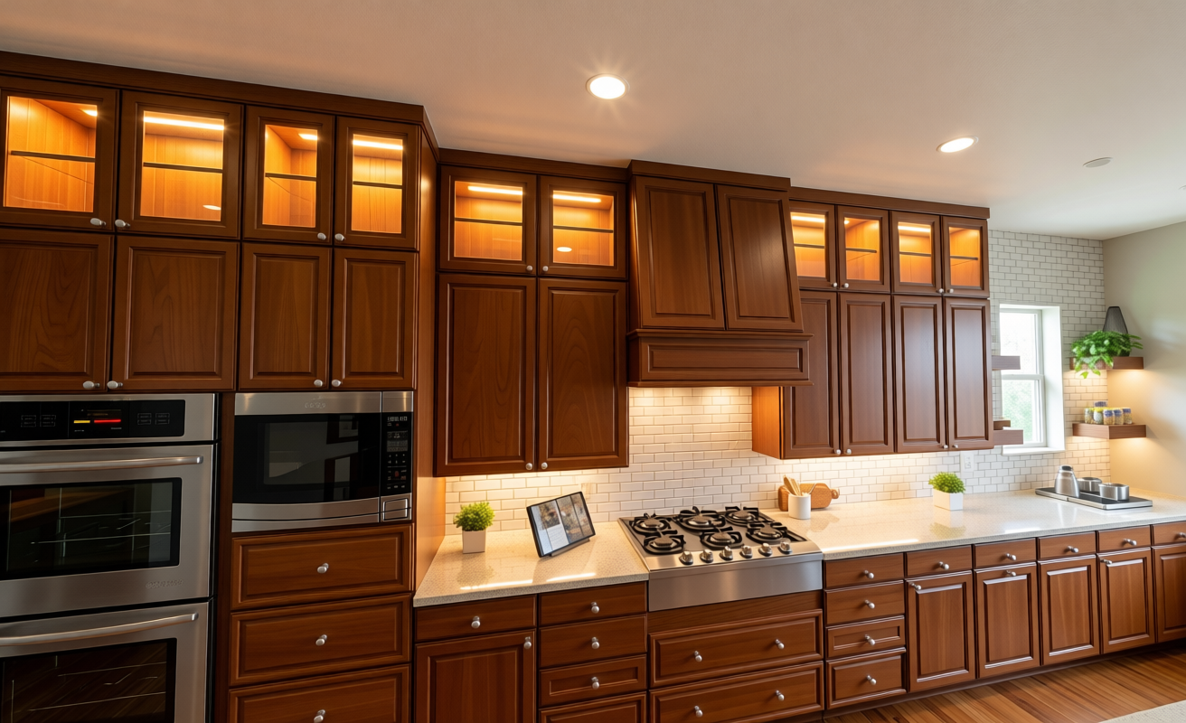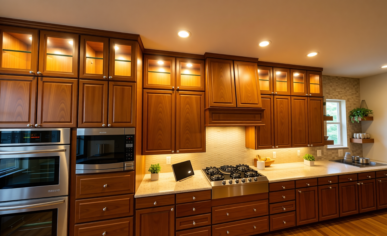 warm wood cabinets with under cabinet lighting glass cabinets with dishes and lighting lighting under shelves create an inviting kitchen