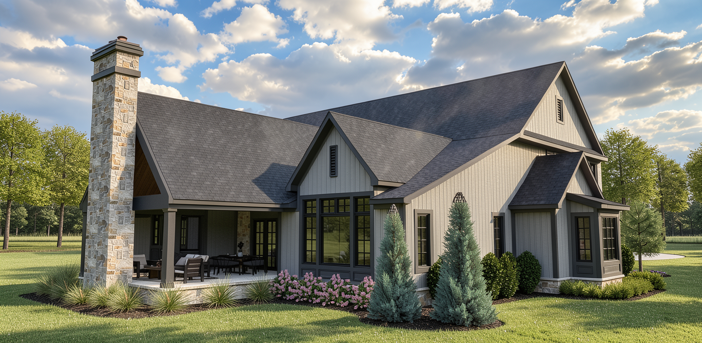 partly cloudy sky deciduous trees in background charcoal trim black windows