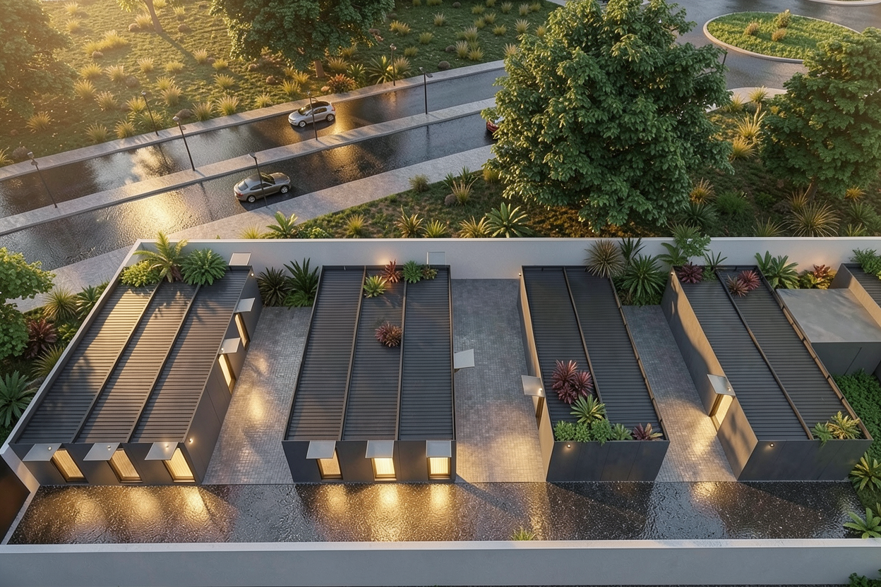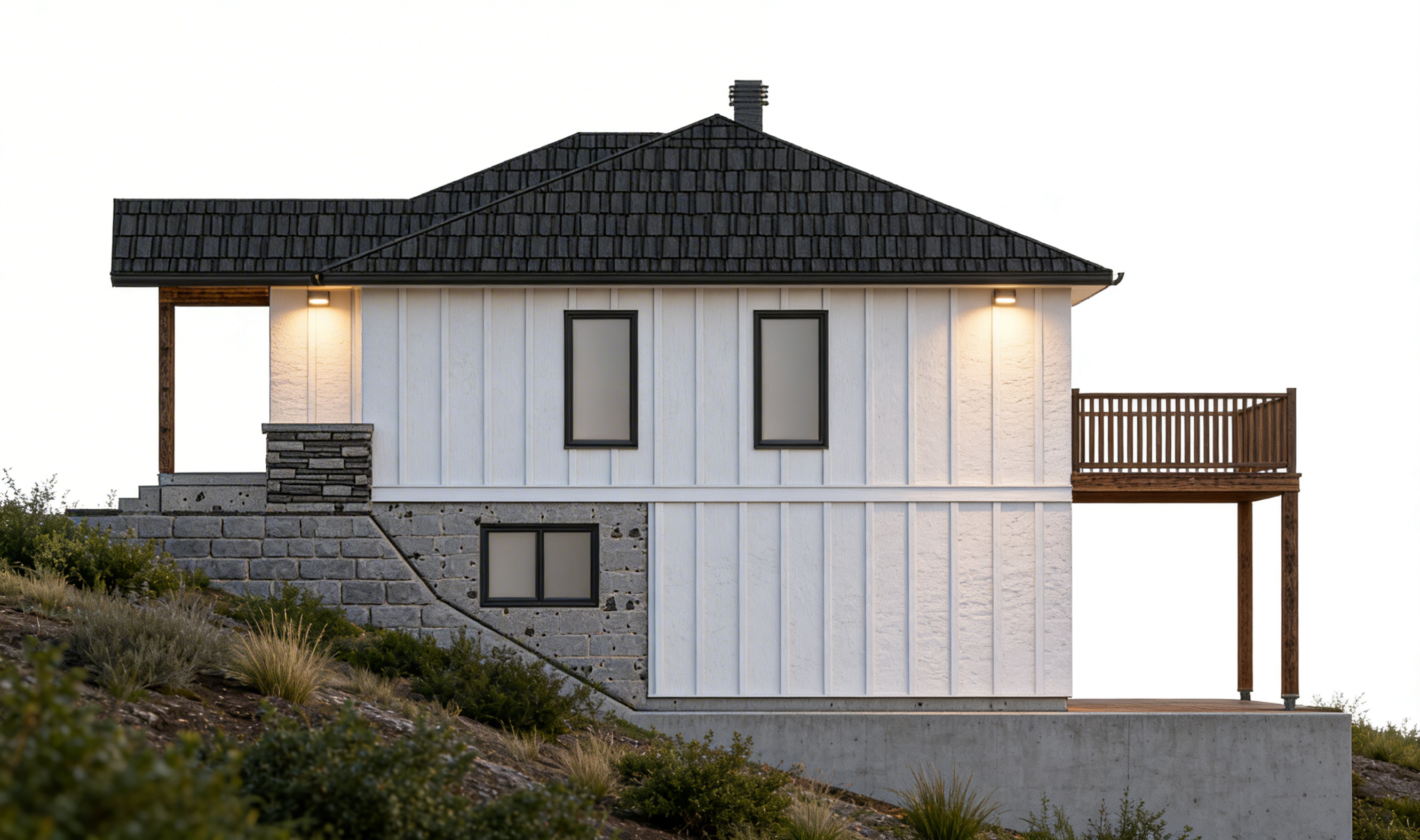 add vegetation white board and batten gray stone bricks gray concrete foundations