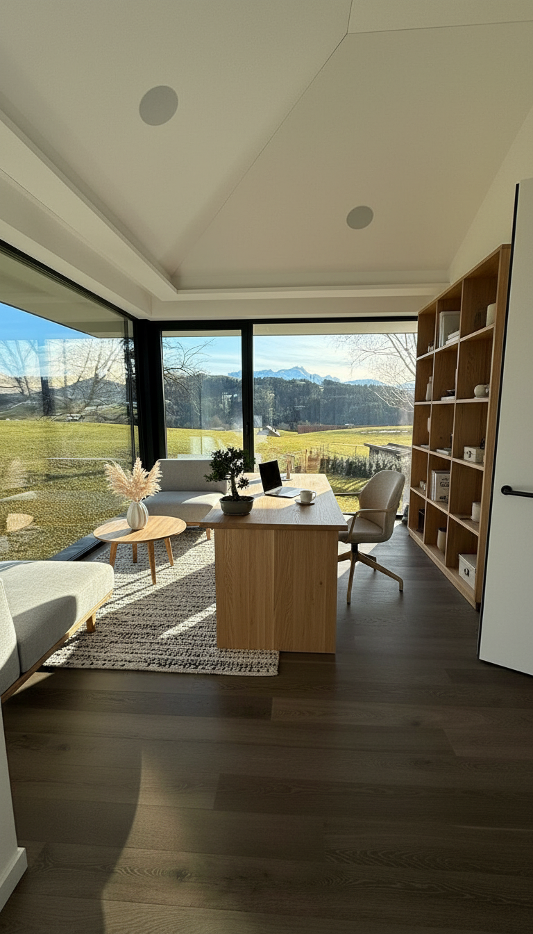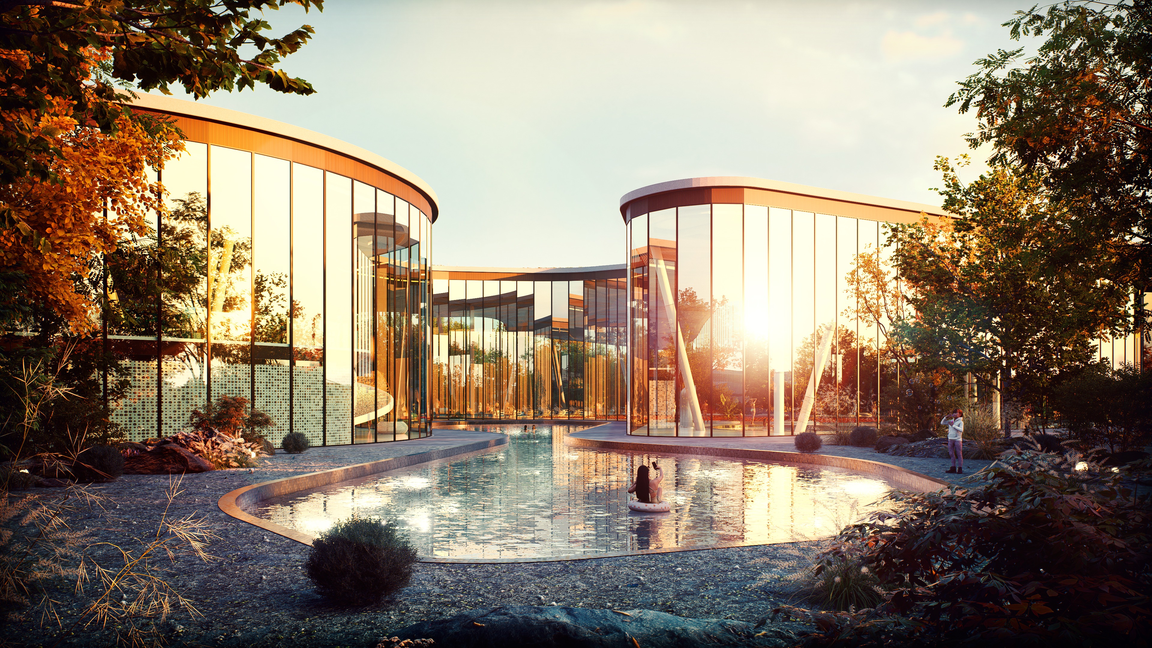 important preserve the existing geometry and the existing context exactly as provided preserve the existing windows do not add new windows do not modify alter reinterpret add remove scale or reshape any geometry do not change the site surroundings street layout neighboring buildings vegetation or context elements do not modify geometry scale proportions buildings road layout sidewalks or surrounding context in any way do not modify text soft sunny noon atmosphere diffused neutral natural daylight with subtle tones cinematic architectural mood weak interior lighting 4000k slight glowing from inside large glass surfaces with realistic reflections soft mirror effect environmental reflections of sky and surroundings important do not add new windows