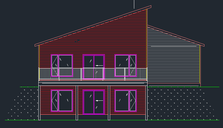 its the right side elevation of the house all windows are black for modern look the roof is a black steel roof the horizontal siding its a withe vinyle all facia and soffit are black the patio is in treated wood the structural frame is capped with black aluminium with 42 railling the land is a forest